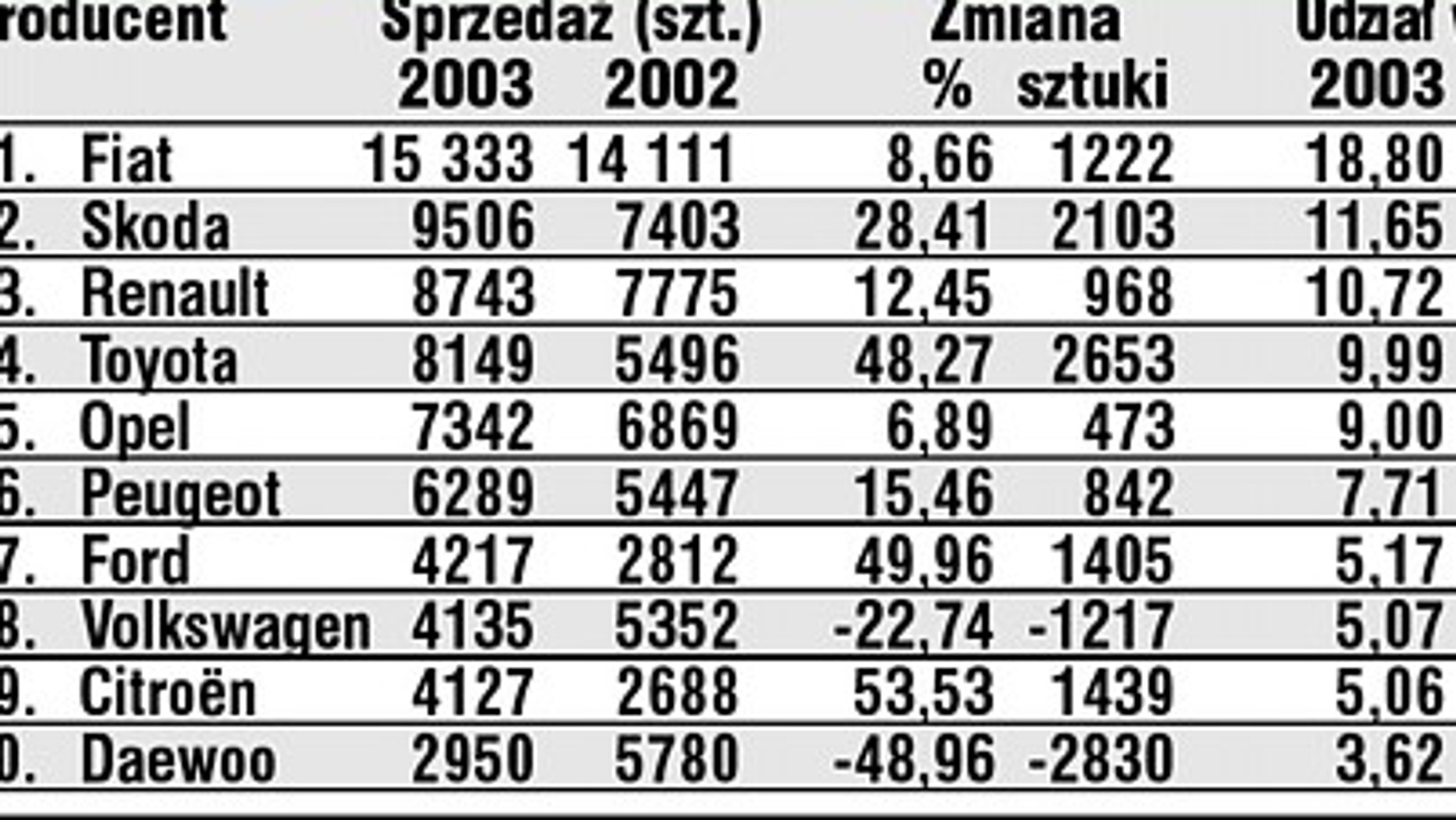 W porównaniu z marcem 2002 roku wynik ten był o ponad 15 proc. lepszy. W ciągu pierwszego kwartału 2003 roku sprzedano ponad 80 tys. samochodów (81 566 sztuk). Zanotowany wzrost na koniec kwartału wyniósł 11,96 proc. Pierwszych pięć firm w rankingu producentów nie zanotowało zmian. Na pierwszej pozycji znajduje się Fiat, którego sprzedaż wzrosła w stosunku do ubiegłego roku o 8,66 proc. Pomimo tego udział włoskiego koncernu w rynku zmniejszył się do poziomu 18,8 proc. 48-procentowy wzrost sprzedaży zanotowała czwarta w zestawieniu Toyota, która coraz mocniej naciska znajdujące się przed nią Renault. Większe zmiany nastąpiły w drugiej piątce listy. Najmniejszy wzrost sprzedaży (15,5 proc.) zanotował Peugeot zajmujący szóstą pozycję w rankingu producentów. O dwie pozycje wzwyż przesunął się Ford, który w ubiegłym miesiącu uplasował się na dziewiątym miejscu. Całkowita sprzedaż Forda w ciągu trzech miesięcy 2003 roku wyniosła ponad 4,2 tys. sztuk, o 50 proc. więcej niż rok temu. Na ósmej pozycji utrzymał się Volkswagen, którego sprzedaż zmalała jednak prawie o 23 proc. Pierwszy kwartał VW zamknął wynikiem 4135 aut - o 8 egzemplarzy lepszym niż zajmujący dziewiąte miejsce CitroĎn (w zeszłym miesiącu siódma pozycja). Jednak francuska firma w porównaniu z analogicznym okresem sprzed dwunastu miesięcy zanotowała wśród najpopularniejszych marek w Polsce największy przyrost sprzedaży - 53,5 proc. Pierwszą dziesiątkę listy podobnie jak miesiąc temu zamknęło Daewoo. Od początku roku na auta tej marki znalazło się ponad 2,9 tys. nabywców, o 49 proc. mniej niż przed rokiem.