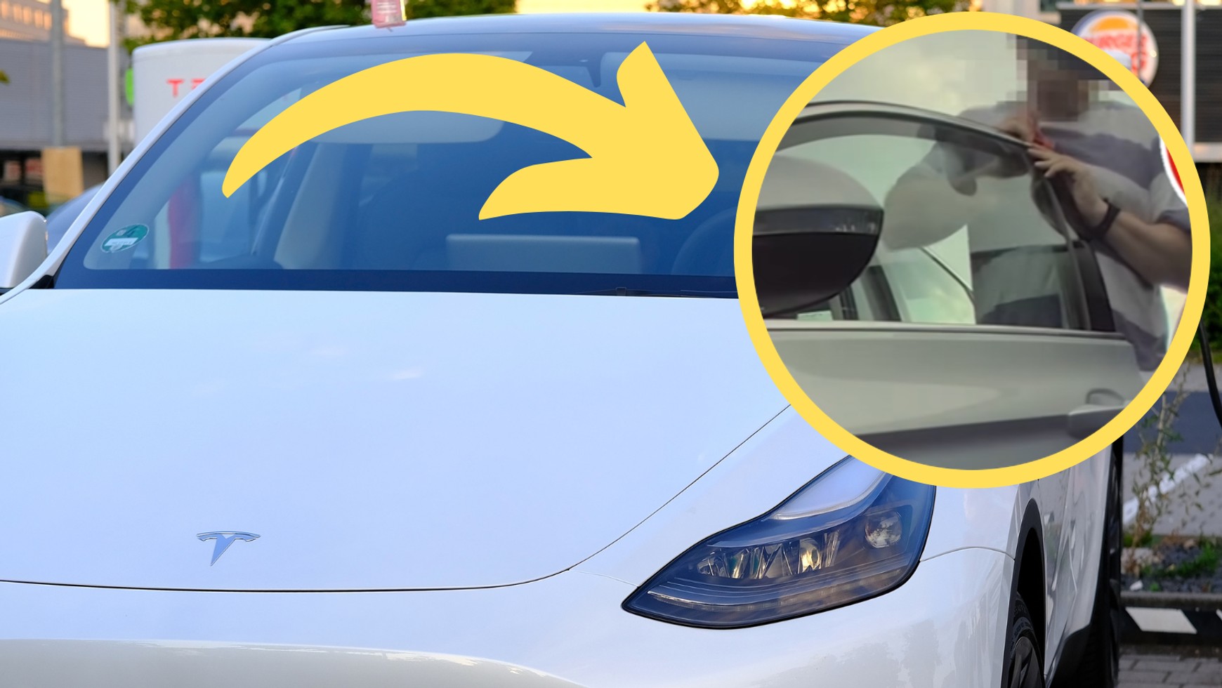 Na filmiku można dostrzec, że koła pojazdu stojącego obok Tesli rzeczywiście dotykają linii wyznaczającej miejsce parkingowe. Następnie widzimy, jak kierujący chcąc dostać się do swojego samochodu, specjalnie uderza drzwiami Teslę. Po kilku sekundach wsiada do samochodu i odjeżdża.