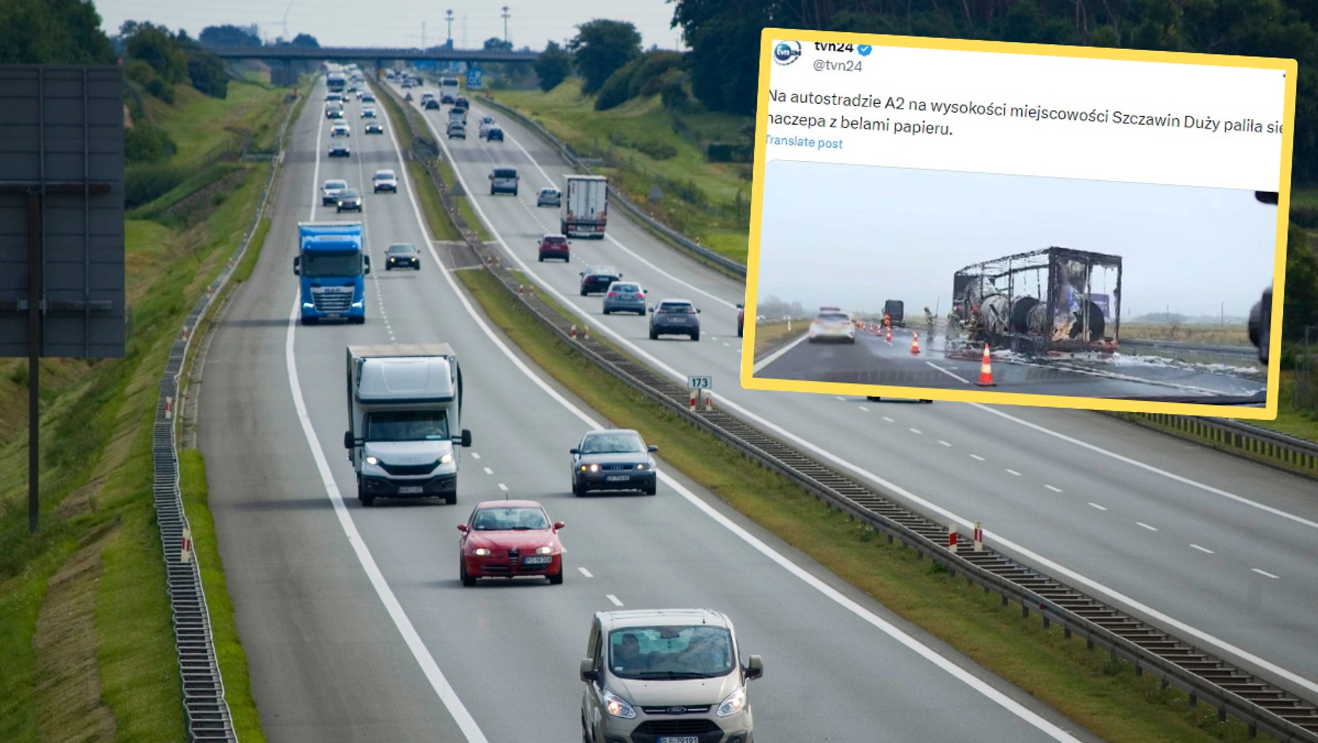 Do pożaru doszło na wysokości miejscowości Szczawin Duży. Na drodze w kierunku Warszawy utworzyły się potężne korki. Najbardziej prawdopodobną przyczyną pożaru było uszkodzenie układu hamulcowego. W zdarzeniu nikt nie ucierpiał, bo kierowca w ostatniej chwili odczepił ciągnik siodłowy.