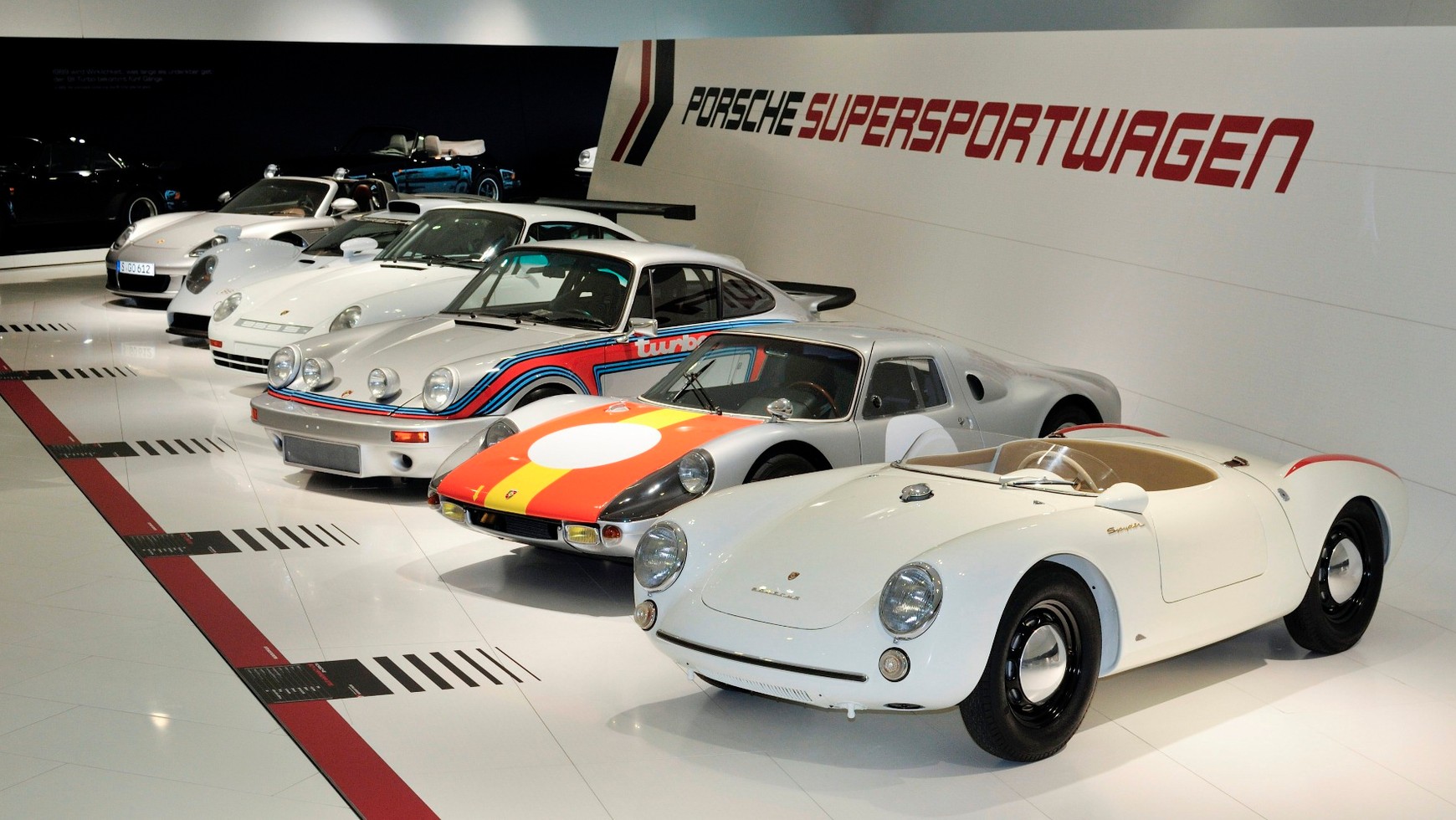 Oczywiście wśród superaut nie mogło zabraknąć Carrery GT - modelu pokazanego po raz pierwszy w 2000 r. na salonie paryskim a także Spydera 550 z połowy lat 50. XX w.