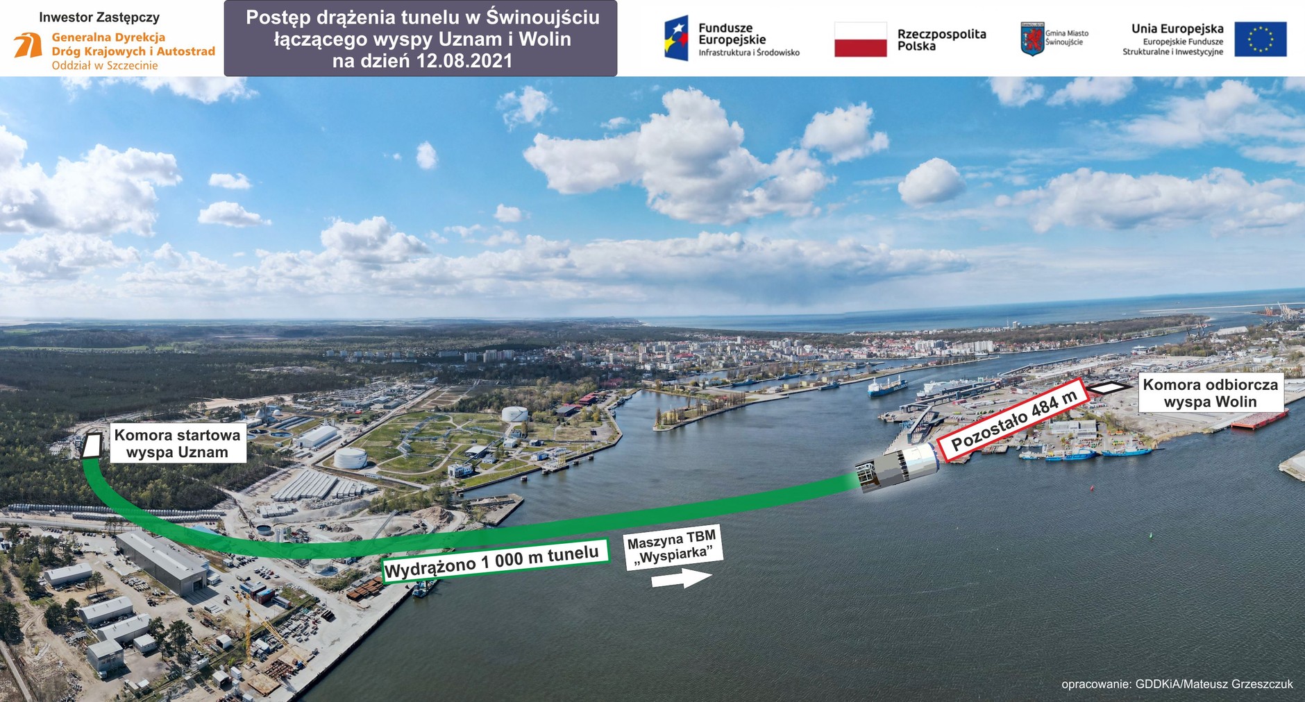 Maszyna drążąca tunel, mający połączyć ze sobą wyspy Uznam i Wolin, wydrążyła kolejne tysiąc metrów, co oznacza, że przeszła już pod cieśniną Świna. Do osiągnięcia komory odbiorczej na końcu tunelu brakuje już tylko 484 metrów. Osiągnięto najniższy punkt tunelu. Obecnie głębokość, na której prowadzone są prace, stale się zmniejsza.