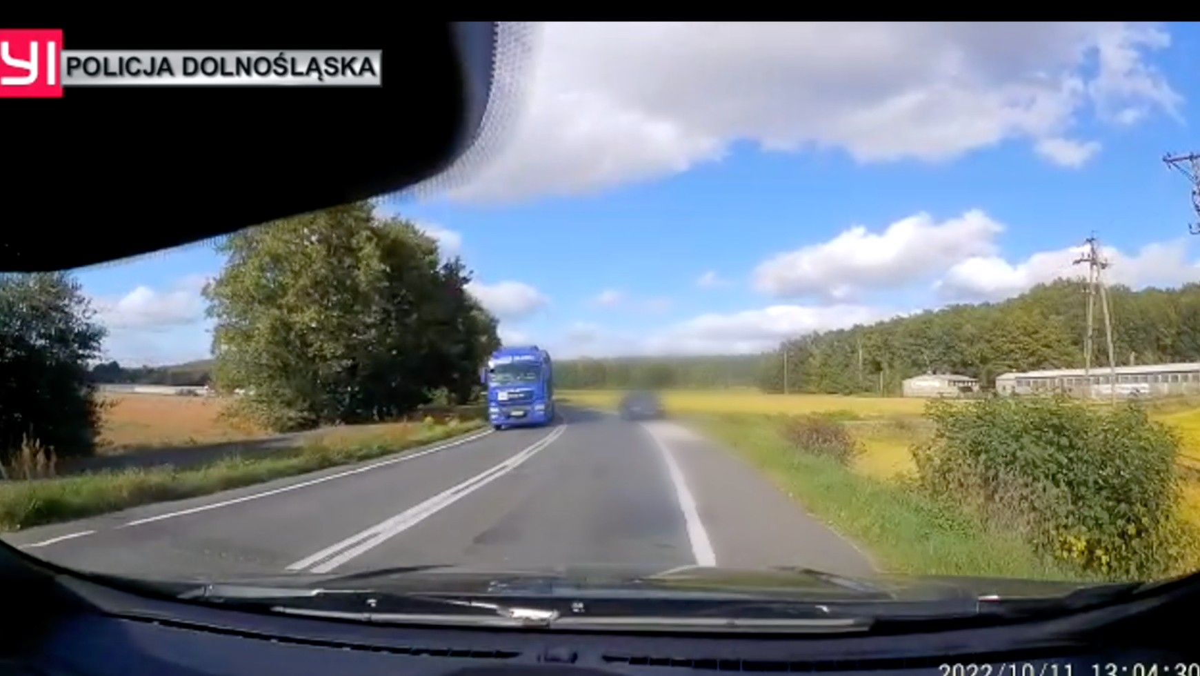 Nie ma żadnego wytłumaczenia dla takiego zachowania na drodze. Kierowca Audi na podwójnej linii ciągłej, na łuku drogi wyprzedzał ciężarówki. Całe zajście możemy dokładnie zobaczyć, dzięki nagraniu kierowcy, który nadjeżdżał z naprzeciwka. Taka jazda 23-latka mogła skończyć się tragicznie, na szczęście wypadku udało się uniknąć.