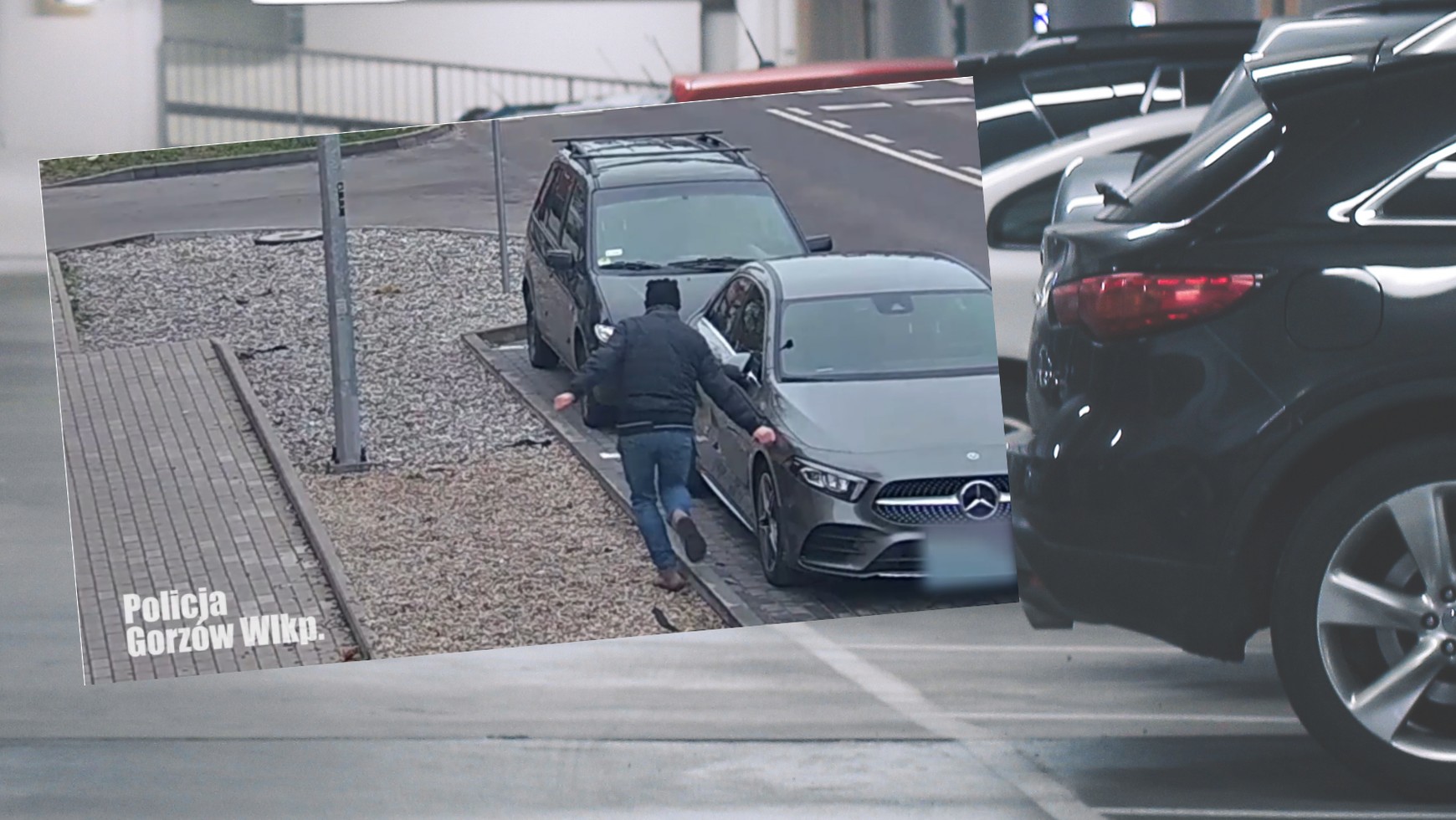 Początkowo podchodzi do słabo ujętego na materiale małego osobowego auta, które rysuje ostrym narzędziem. Następnie podbiegł do kolejnych dwóch samochodów, wśród których znajdował się bardzo drogi Mercedes. Uwagę przykuwa już samo dziwne zachowanie mężczyzny, który na tyle nieostrożnie wymachiwał przedmiotem, że w pewnym momencie omal nie wywrócił się na pokrytej żwirem wysepce, oddzielającej parking od chodnika.
