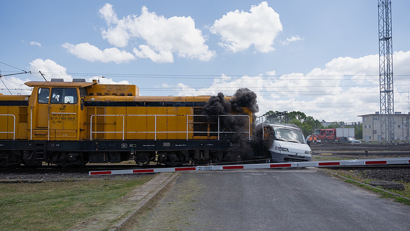 - Podczas symulacji pociąg uderzył w samochód dostawczy. Pokazany został sam wypadek, a także sposoby uniknięcia zderzenia z pociągiem