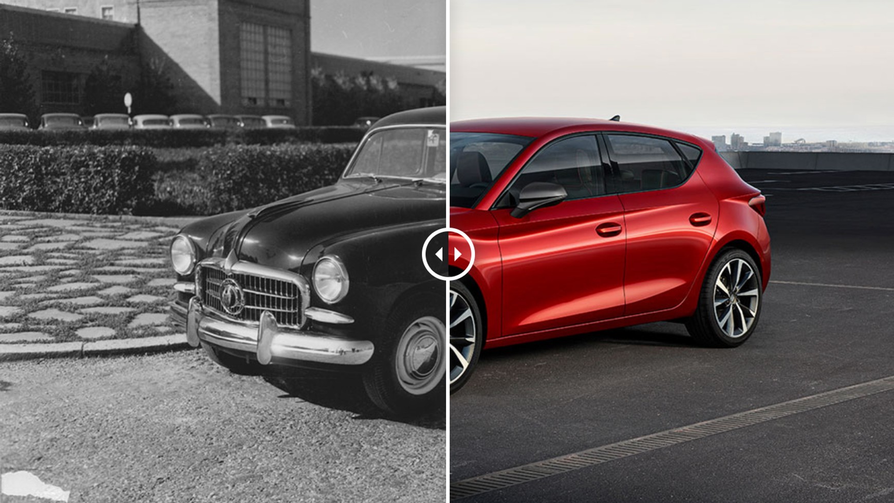 Pierwszy model kontra najnowszy. W 1953 roku zadebiutowało pierwsze auto hiszpańskiej marki – model 1400. 70 lat później możemy podziwiać jej najnowsze dziecko – Leona, symbol ewolucji brandu zachowujący esencję jego charakteru.