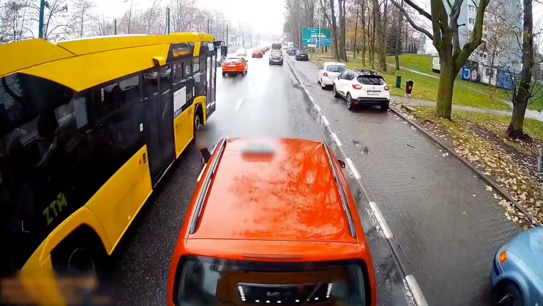 Do funkcjonariuszy z komisariatu VII w Katowicach trafiło nagranie zarejestrowane na ul. Chorzowskiej. Widać na nim, jak kierowca Volkswagena po zmianie pasa ruchu bez żadnego uzasadnienia zaczyna hamować przed jadącą z tyłu ciężarówką i niemal doprowadza do kolizji. Co więcej, kierujący osobowym autem wysuwa przez okno rękę i pokazuje szoferowi ciężarówki obraźliwy gest.