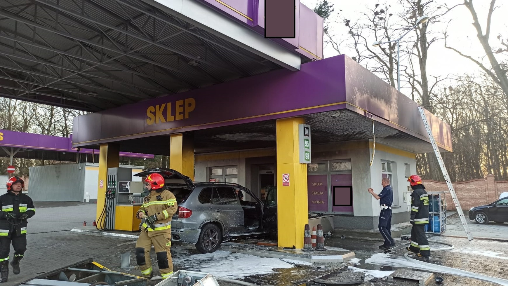Działania straży pożarnej polegały przede wszystkim na zabezpieczeniu miejsca zdarzenia. Ponieważ ratownicy mieli do czynienia z obiektem, który korzysta z podziemnych zbiorników paliw, to podjęli oni decyzję o podaniu jednego prądu wody w obronie na budynek stacji paliw oraz jednego prądu piany ciężkiej na palący się samochód, oraz dystrybutor paliwa.