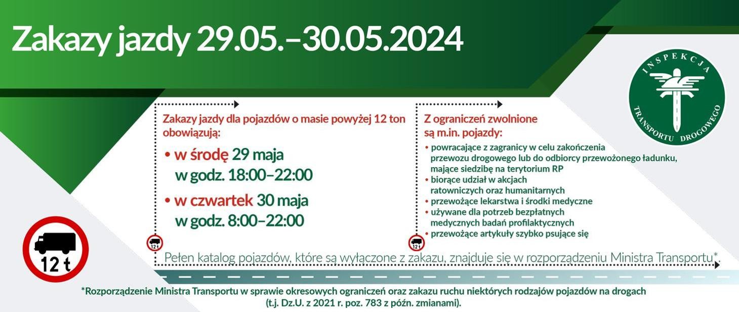 Jak informuje GDDKiA, w okresie długiego weekendu ograniczony będzie ruchu pojazdów o dopuszczalnej masie całkowitej powyżej 12 ton. Zakaz wydany przez GITD obowiązuje w całej Polsce w dniach - 29 maja w godzinach od 18.00 do 22.00, natomiast w dniu 30 maja w godzinach od 8.00 do 22.00. Obowiązuje na drogach publicznych na obszarze całego kraju.