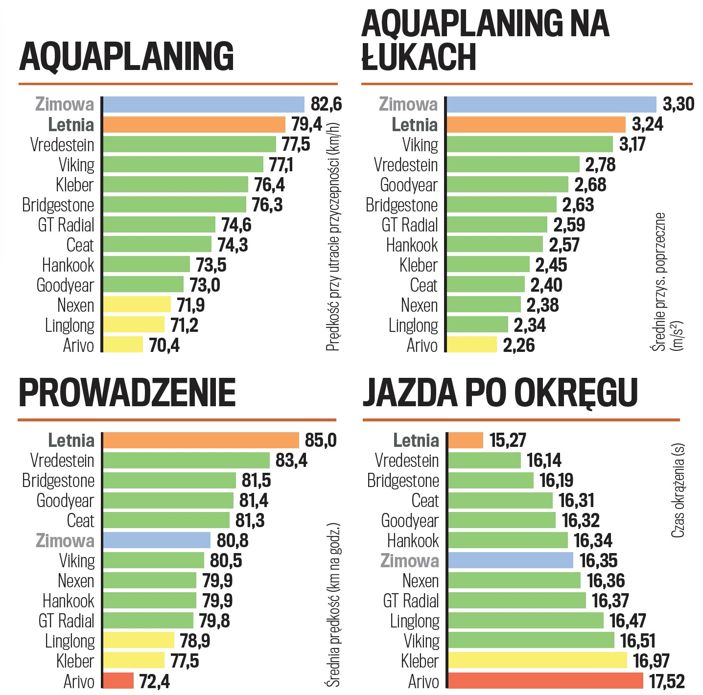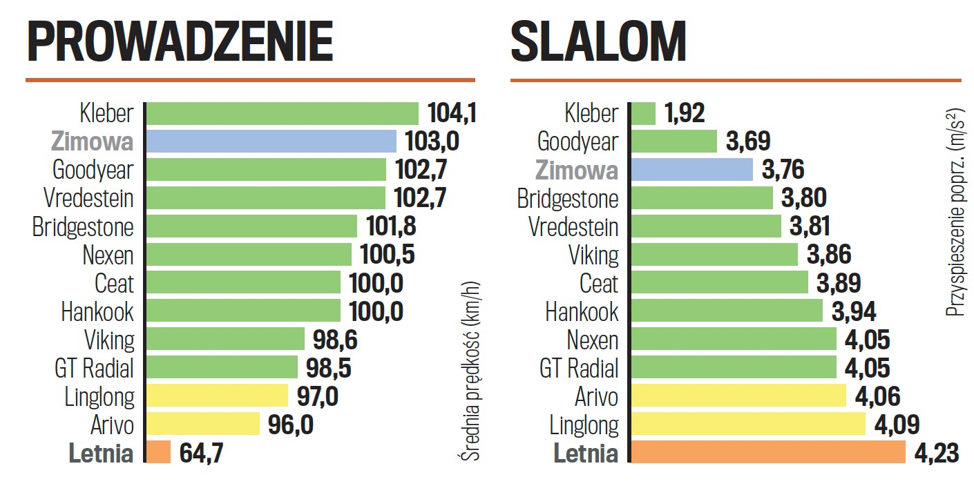 Niestety, na mokrym podłożu widać wyraźnie, że konstrukcja opon marki Kleber została zoptymalizowana pod kątem jazdy po śniegu – na mokrej nawierzchni radzą sobie one znacznie gorzej. Bridgestone oraz Goodyear wydają się najlepszym kompromisem, we wszystkich dyscyplinach na mokrej nawierzchni radzą sobie bardzo dobrze.