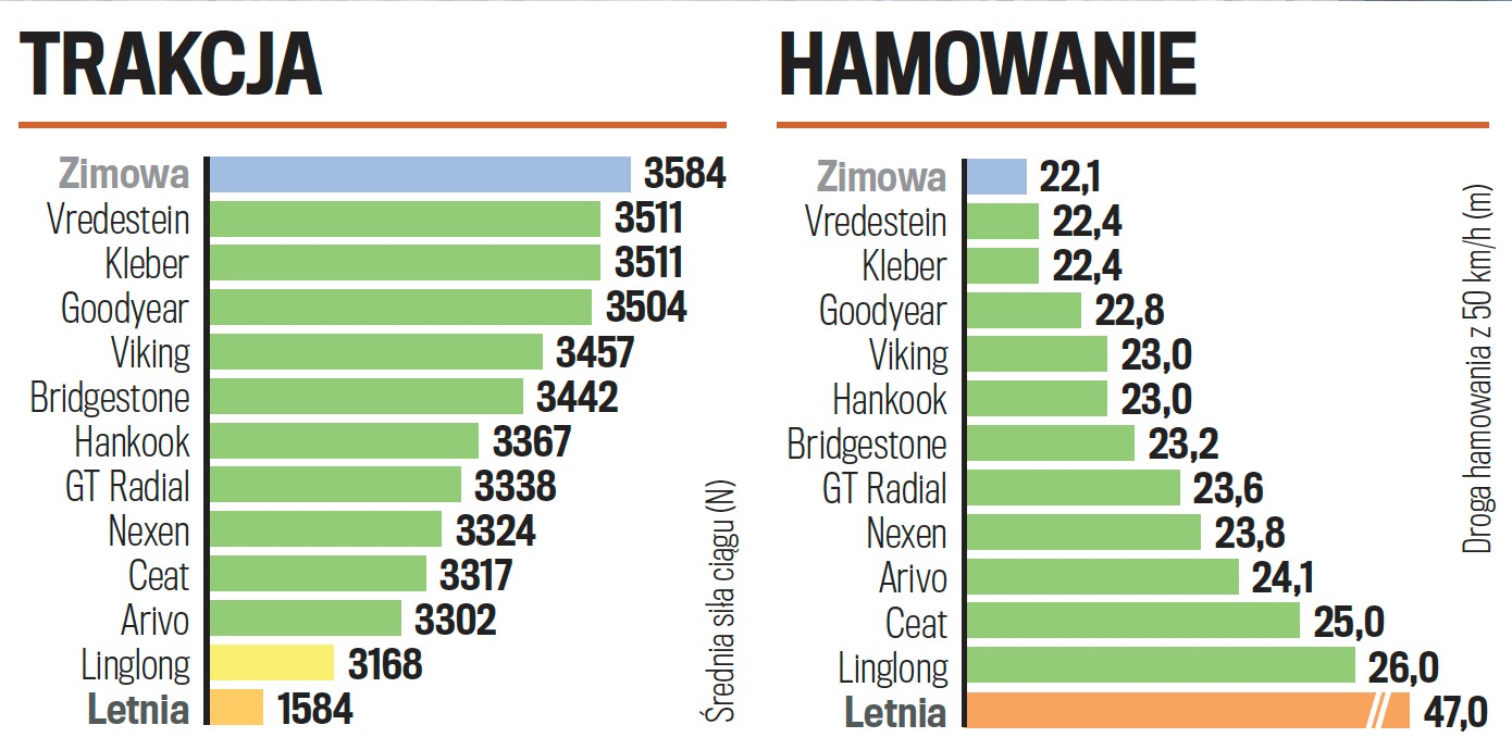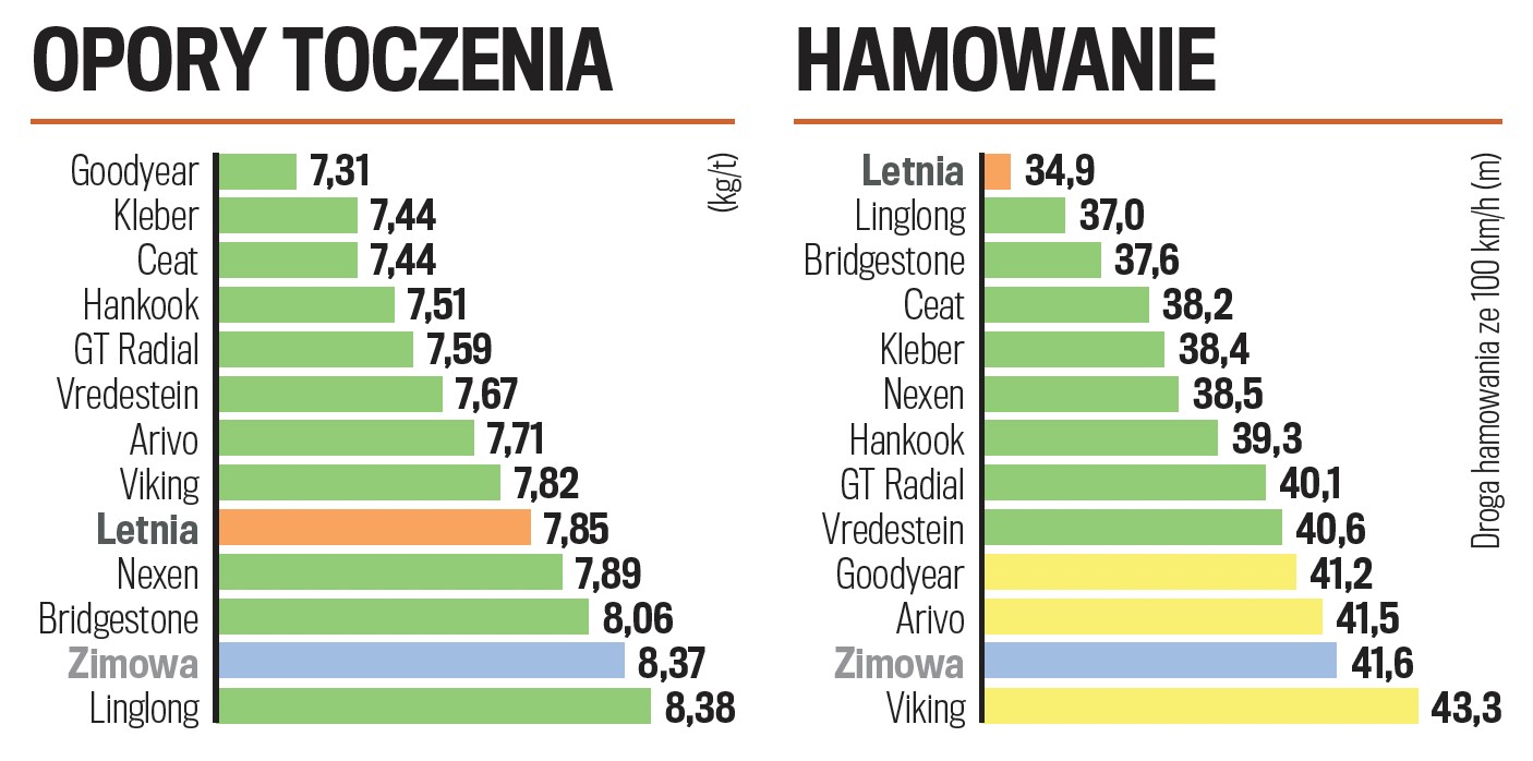 Na oponach marki Bridgestone auto hamuje i prowadzi się bardzo dobrze, chociaż w dziedzinie prowadzenia nieco lepiej wypadają opony marki Hankook. Opony marki Goodyear mają wprawdzie niskie opory toczenia, ale hamowanie na suchym nie jest ich najmocniejszą stroną. To żadne pocieszenie, że produkty marek Arivo oraz Viking wypadają jeszcze gorzej. Niedrogie opony Ceat we wszystkich próbach na suchym trzymają przyzwoity poziom.