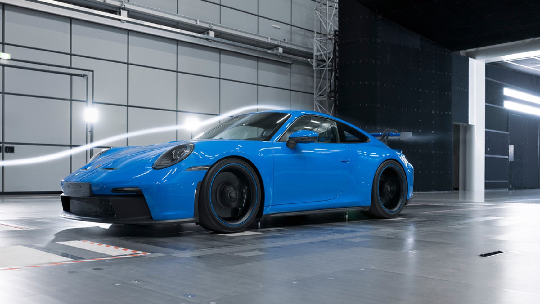 Aerodynamika to oczko w głowie działu rozwoju. W tunelu aerodynamicznym Porsche można symulować dowolną sytuację na drodze i na torze. Udoskonalenie aerodynamiki najnowszego Porsche 911 GT3 w stosunku do poprzednika wymagało poddania go 700 symulacjom i dostrajania jej w tunelu aerodynamicznym przez 160 godzin. Smaczkiem technicznym nowego modelu jest konstrukcja tylnego spoilera zawieszonego na mocowaniu w kształcie łabędziej szyi – podobne rozwiązanie stosowane było dotychczas tylko w samochodach startujących w wyścigach (GT 911 RSR i 911 GT3 Cup). Tylne skrzydło i przedni splitter można – każde osobno – ustawiać w czterech różnych pozycjach. Wszystkie te zabiegi przyniosły pożądane efekty – siłę docisku w ekstremalnych warunkach większą o 150 proc. niż w poprzednim GT3 i doszlifowany do perfekcji, indywidualnie dostosowywany balans aerodynamiczny.