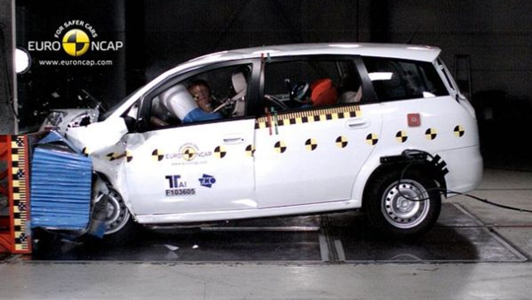 Testy europejskiego programu oceny nowych samochodów (NCAP - New Car Assessment Programme) zostały tak obmyślane, aby odtworzyć pewne typowe wypadki. A więc zderzenie czołowe to nie wbicie się jednego auta w drugie, ale kraksa z przesunięciem. Takim, że samochód uderza 40 proc. swojej szerokości od strony kierowcy w deformowalną, nieruchomą przeszkodę. Wystające, wsteczne lusterka nie są wliczane do tej szerokości. Prędkość wynosi zawsze 64 km/h i jest o 8 km/h wyższa niż zalecają władze wspólnoty (56 km/h), konkretnie European Enhanced Vehicle-safety Committee. Szerokość "miękkiej", aluminiowej bariery została określona na 1 metr, jej głębokość na 54 centymetry. Poza kierowcą z przodu kabiny jest zawsze dorosły pasażer obok niego.