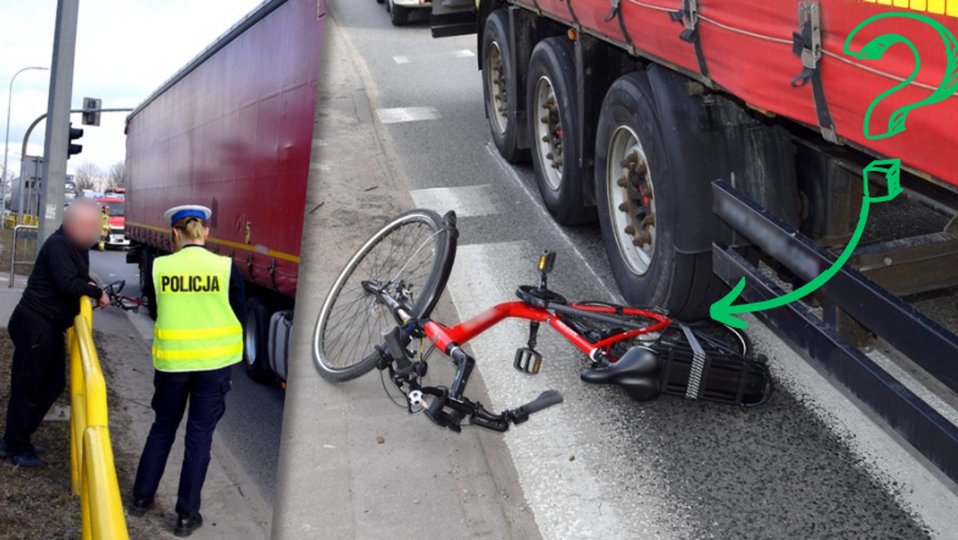 Dalszy ciąg artykułu pod materiałem wideoJednak jedno zdjęcie może wzbudzać pewne wątpliwości. Widać na nim rower z przygniecionym i odkształconym przez naczepę tylnym kołem. Sugeruje to, że rowerzystka musiałaby wjechać na przejście pieszo-rowerowe tyłem, co brzmi dość kuriozalnie. Wyjaśnienie "zagadki" jest jednak dość proste.