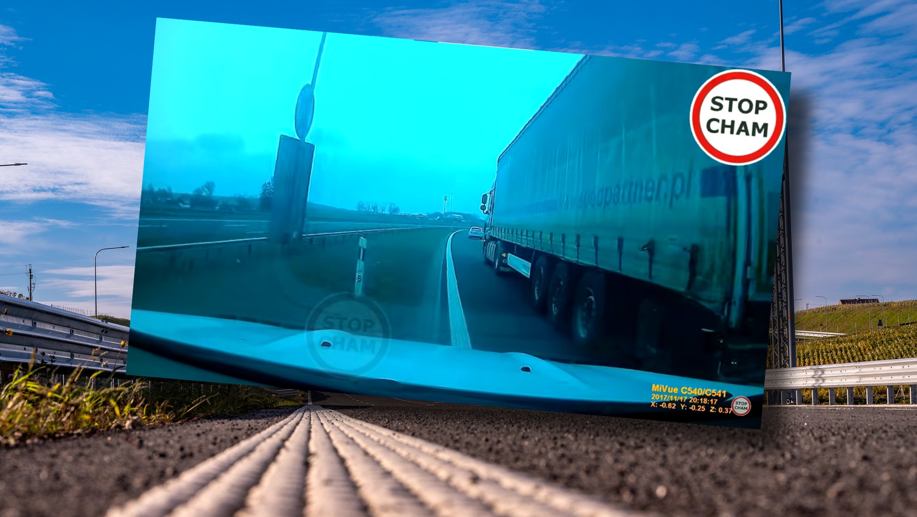 Nagrywający oczywiście próbuje hamować, ale szybko się okazuje, że różnica prędkości między ciężarówką a osobówką jest zbyt duża. W takiej sytuacji podejmuje najlepszą możliwą decyzję i w celu uniknięcia kolizji, zjeżdża na pas zieleni, unikając przy tym uderzenia w słupek kilometrowy.