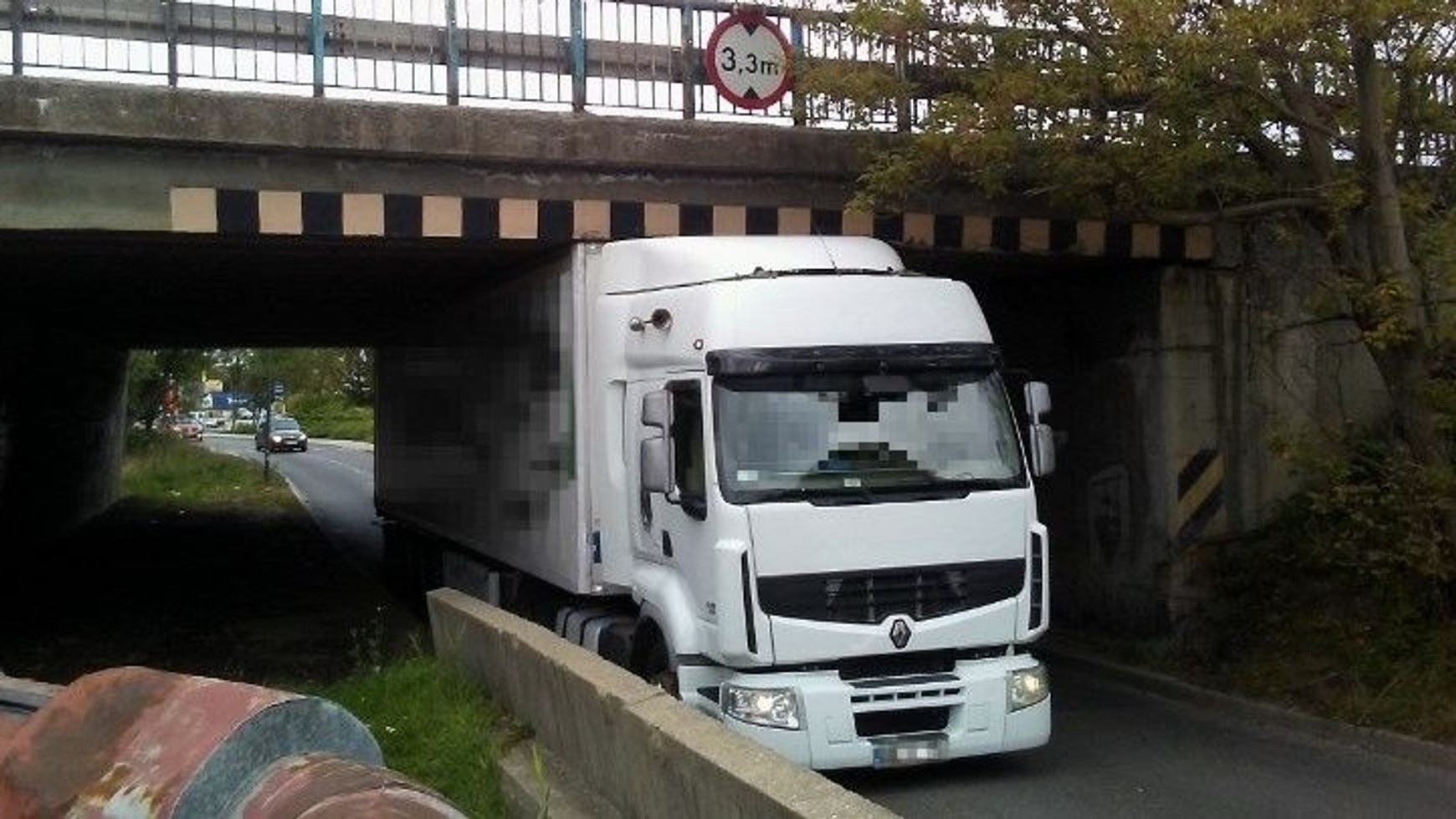 Podwójnego pecha miał kierowca TIR-a, który próbował przecisnąć się pod niskim wiaduktem na ul. Zuzanny w Sosnowcu. Po pierwsze, nie udał mu się ten manewr – kabina przeszła, ale naczepa zaklinowała się pod wiaduktem. Kierowca, który był zarazem właścicielem firmy transportowej, tłumaczył się inspektorom ITD, że już nie raz udawało mu się przejechać pod wiaduktami ograniczającymi wysokość pojazdów do 3,3 m.