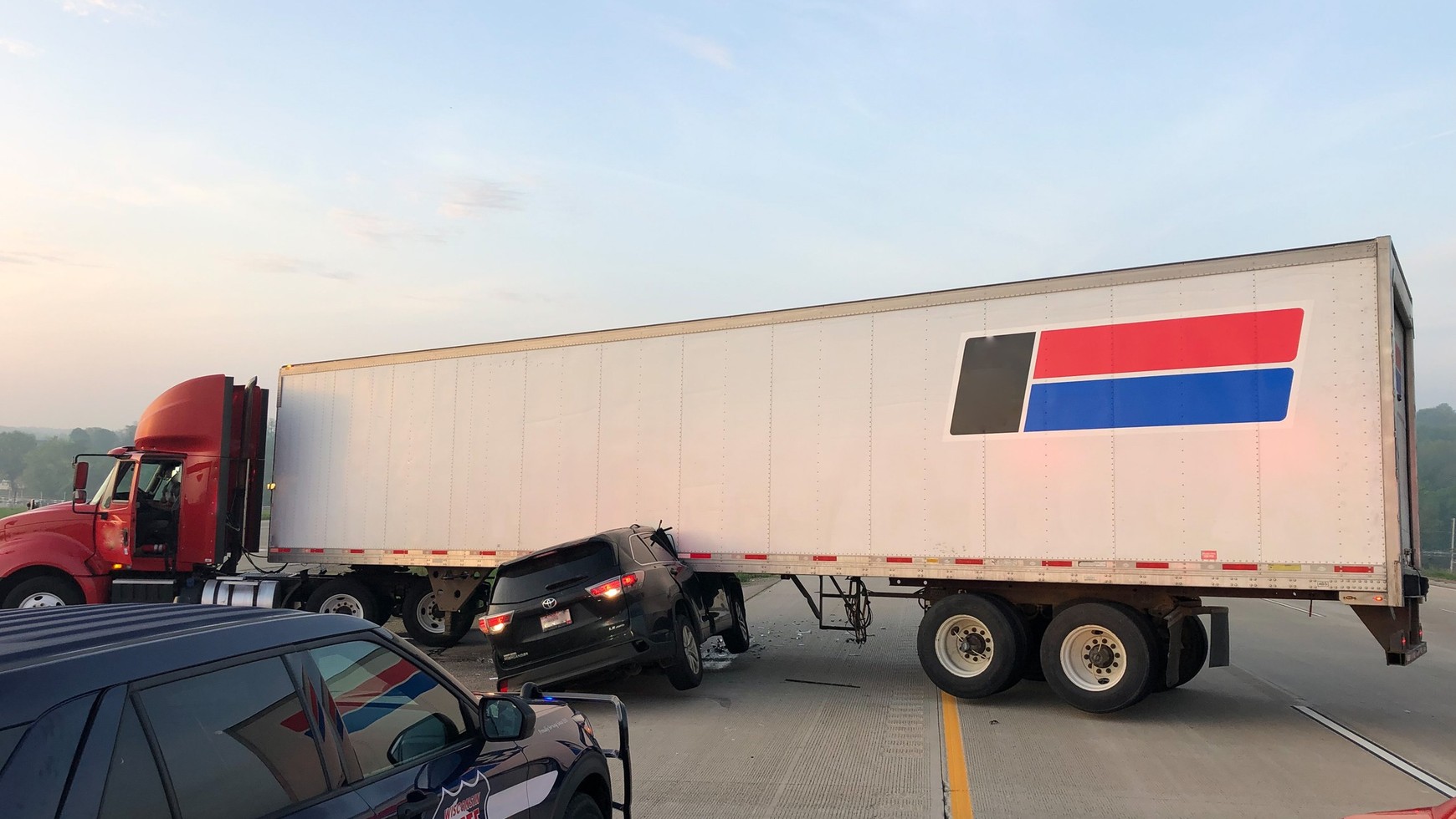 O tym, jak niebezpieczna może być jazda amerykańską autostradą, przekonał się kierowca SUV-a Toyota Higlander. Jak można wywnioskować z informacji oraz zdjęcia opublikowanych w serwisie Facebook przez policję stanową z Wisconsin, do wypadku doprowadził najprawdopodobniej kierujący samochodem ciężarowym, który próbował zawrócić w niedozwolonym miejscu. Fakt, że w wypadku nie było ofiar śmiertelnych, może zakrawać na cud, bo Toyota wbiła się pod naczepę tak mocno, że zatrzymała się dopiero na słupkach B, co oznacza zniszczenie przedniej części kabiny.