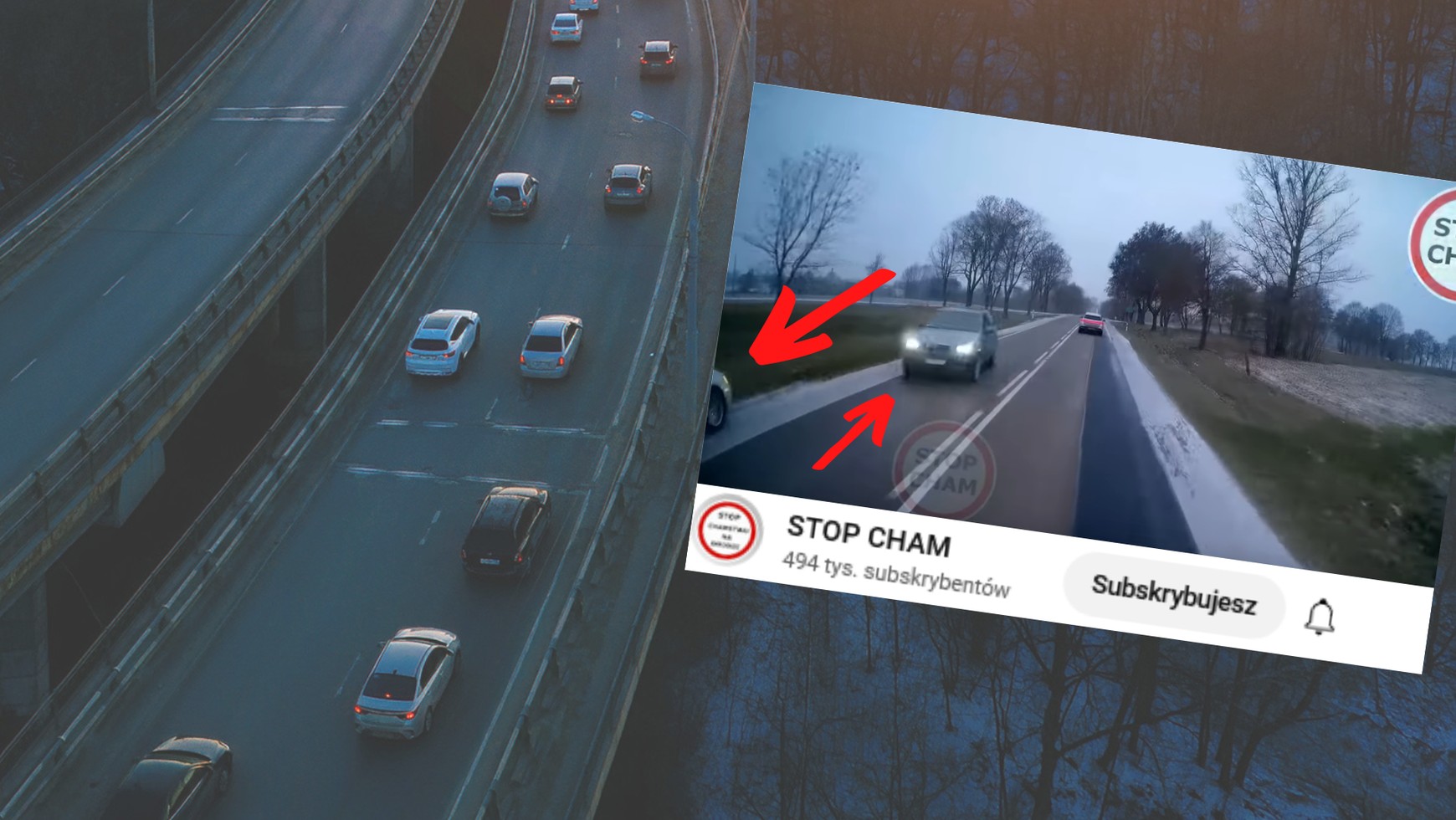 Na początku filmu kierowca Mercedesa wyprzedza widza kanału "Stop Cham", przez co wydaje się, że to właśnie on jest głównym bohaterem nagrania. Faktycznie — jadący SUV-em źle obliczył odległość, przez co mocno przestraszył kierowcę BMW. Ten zaczął mrugać "długimi". Osobom postronnym może wydawać się, że chciał w ten sposób ostrzec kierowcę Mercedesa. Okazuje się jednak, że mógł widzieć kolejnego kierowcę Skody, który jechał za Mercedesem.