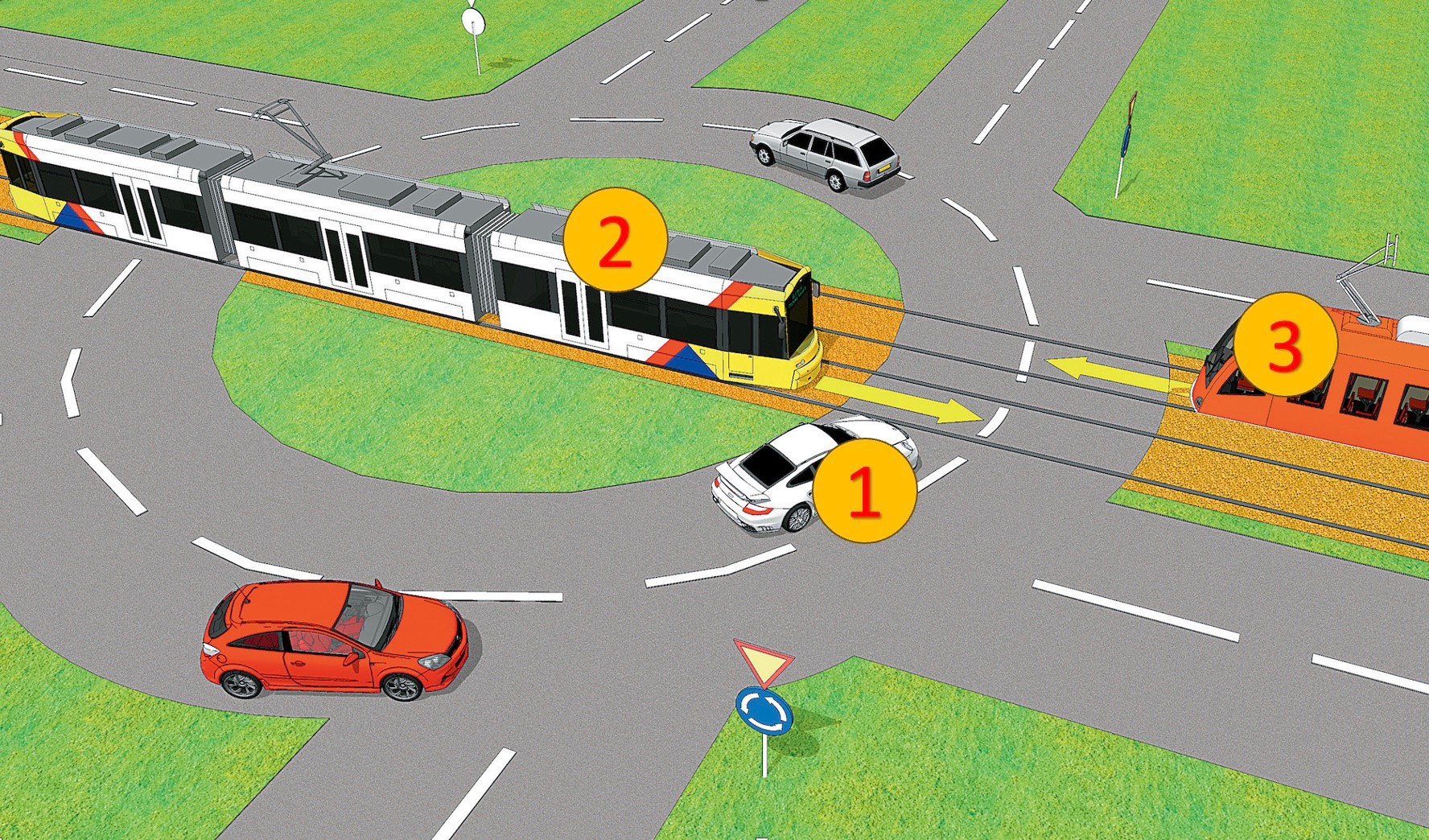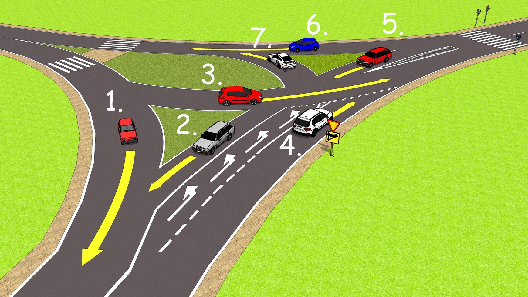 Na tym rondzie kierujesz pojazdem nr 1. Będąc w tym miejscu, masz obowiązek ustąpić pierwszeństwa: