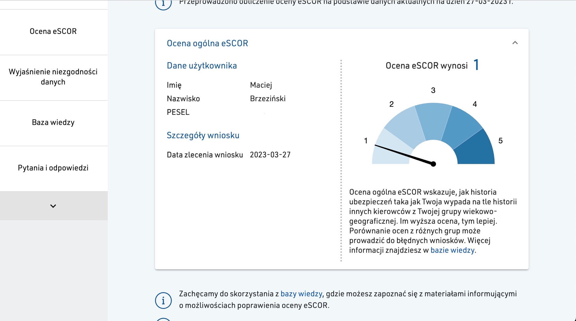 Precyzyjnie rzecz ujmując, chodzi o ocenę kierowcy tworzoną przez Elektroniczny System Centralnej Oceny Ryzyka (eSCOR). System na podstawie historii ubezpieczeniowej ocenia kierowcę pod kątem potencjalnego ryzyka, jakie wiążą się z ubezpieczaniem samochodów tej osoby. Każdy ubezpieczyciel ma te dane i może brać je pod uwagę, tworząc oferty kolejnych ubezpieczeń – tańsze dla "bezpiecznych" kierowców z oceną "pięć", nieco droższe dla tych, co mają "czwórkę" itd. Każdy kierowca może pobrać raport na swój temat i sprawdzić, co na niego mają. Ja dostałem ocenę najgorszą – "jedynkę". Już wyjaśniam, jak (prawdopodobnie) do tego doszło.