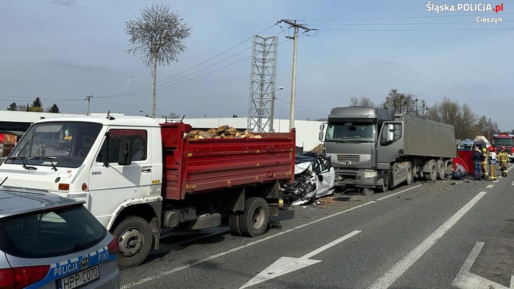 Kilka minut po godz. 11 służby ratownicze otrzymały informację o wypadku, do którego doszło na drodze DW 941 w Ustroniu Nierodzimiu na jezdni prowadzącej w kierunku Wisły. Policjanci przybyli na miejsce zdarzenia wstępnie ustalili, że kierowca osobowego Mercedesa z dużą prędkością uderzył w tył naczepy jadącego zestawu drogowego.