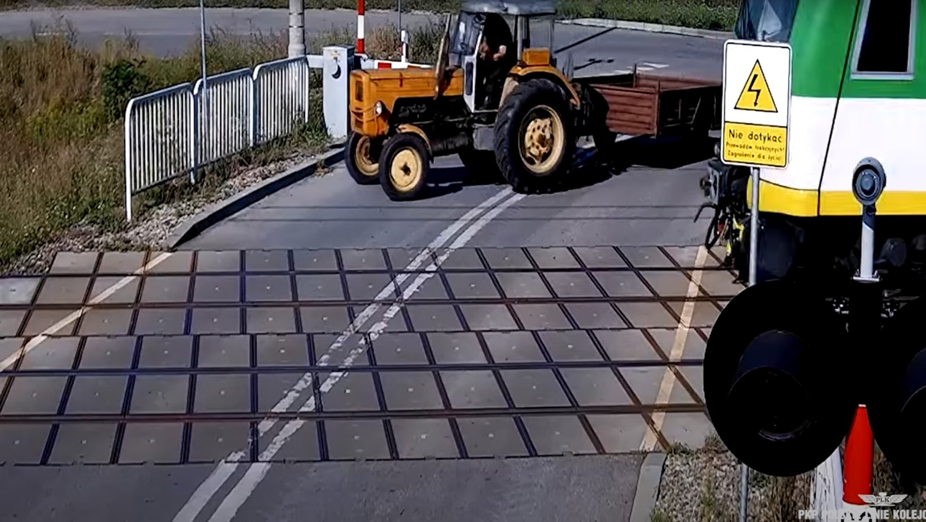 Nie dla każdego opuszczone zapory i migające czerwone światło na sygnalizatorze są wystarczające, by zaniechać wjazdu na przejazd... Polskie Linie Kolejowe opublikowały nagranie z próby przejazdu kierującego ciągnikiem rolniczym z przyczepą. Nie dość, że mężczyzna zignorował szlaban i sygnalizację, to jeszcze próbował przejechać tuż przed rozpędzonym pociągiem.