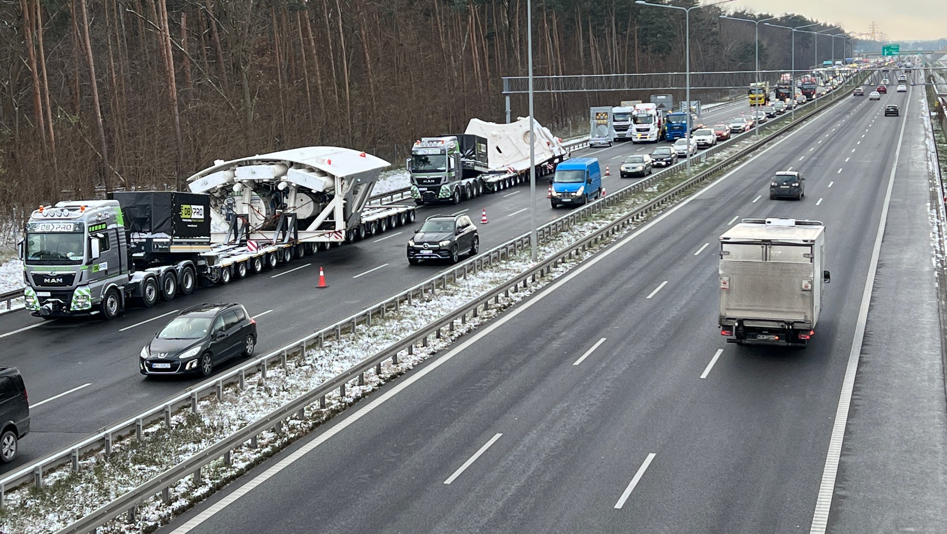 12/29 Transport gigantycznej maszyny czeka przed wjazdem do Warszawy na drodze ekspresowej S8 w pobliżu węzła Janki
