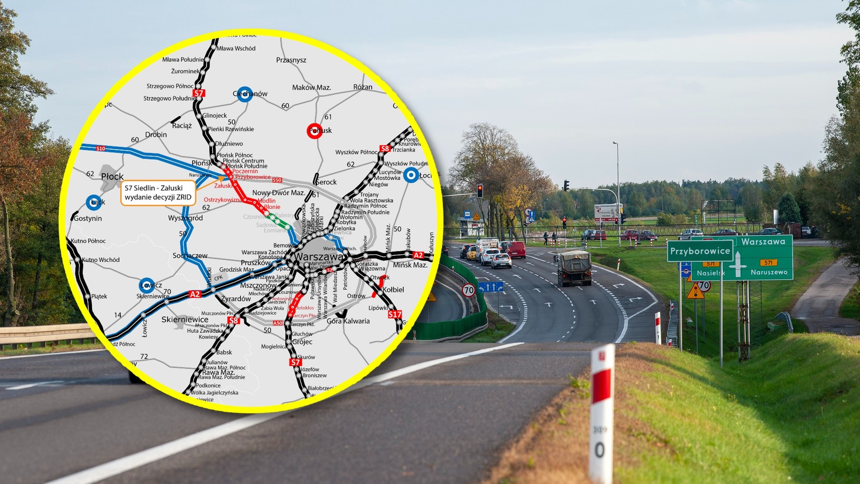 Obecna DK7 Siedlin - Załuski, skrzyżowanie z drogą wojewódzką 571 w PrzyborowicachGDDKiA