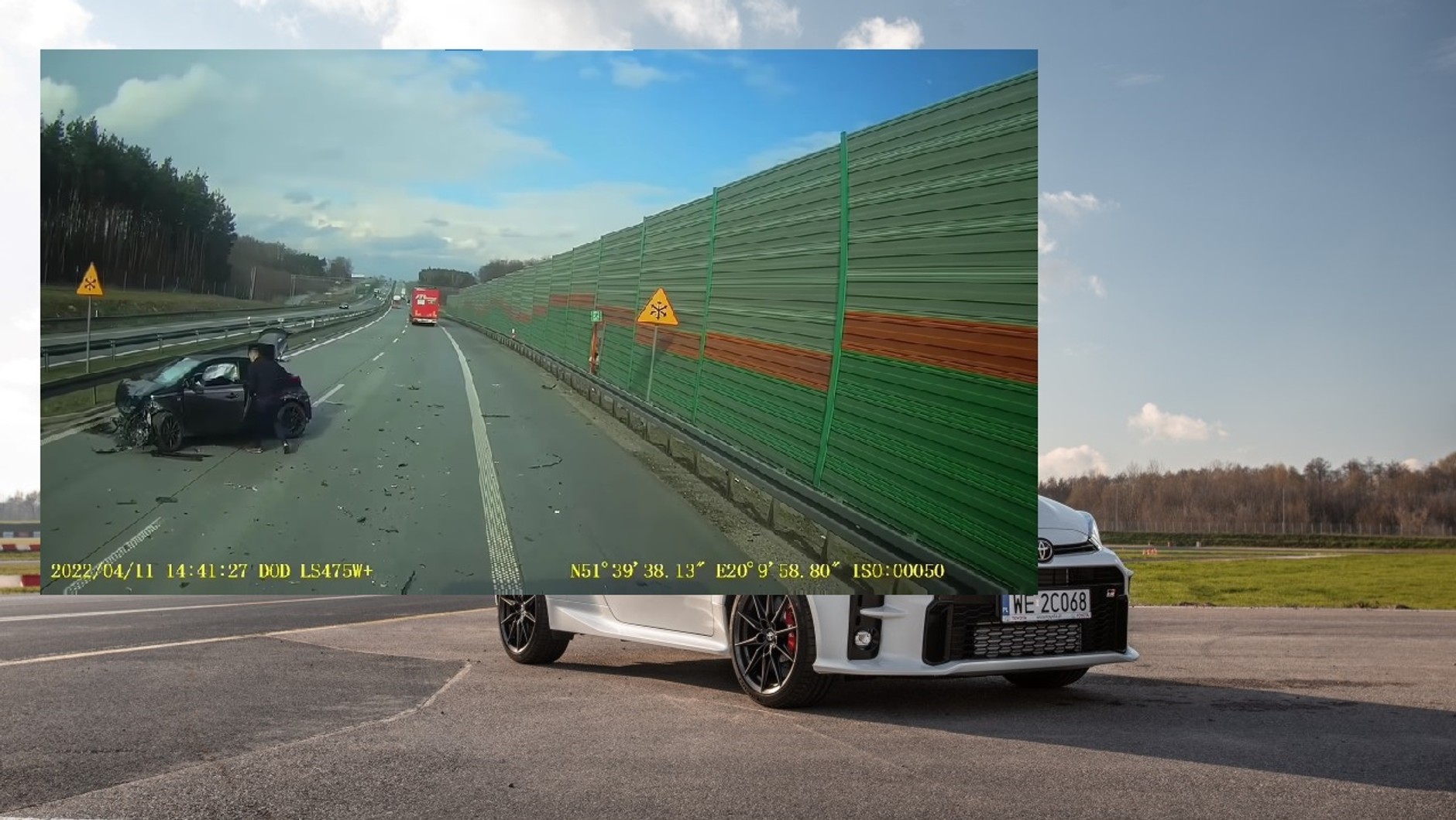 Pewien internauta udostępnił filmik z wideorejestratora, na którym widać, jak czarne Audi A6 i GR Yaris mijają nagrywającego. Trudno określić, czy akurat w tamtym momencie przekraczali prędkość, pewne jednak jest to, że kilka minut później te same samochody znów ukazują się kierowcy ciężarówki. Niestety, tym razem Yaris jest rozbity w drobny mak, a Audi ma zniszczony przód.