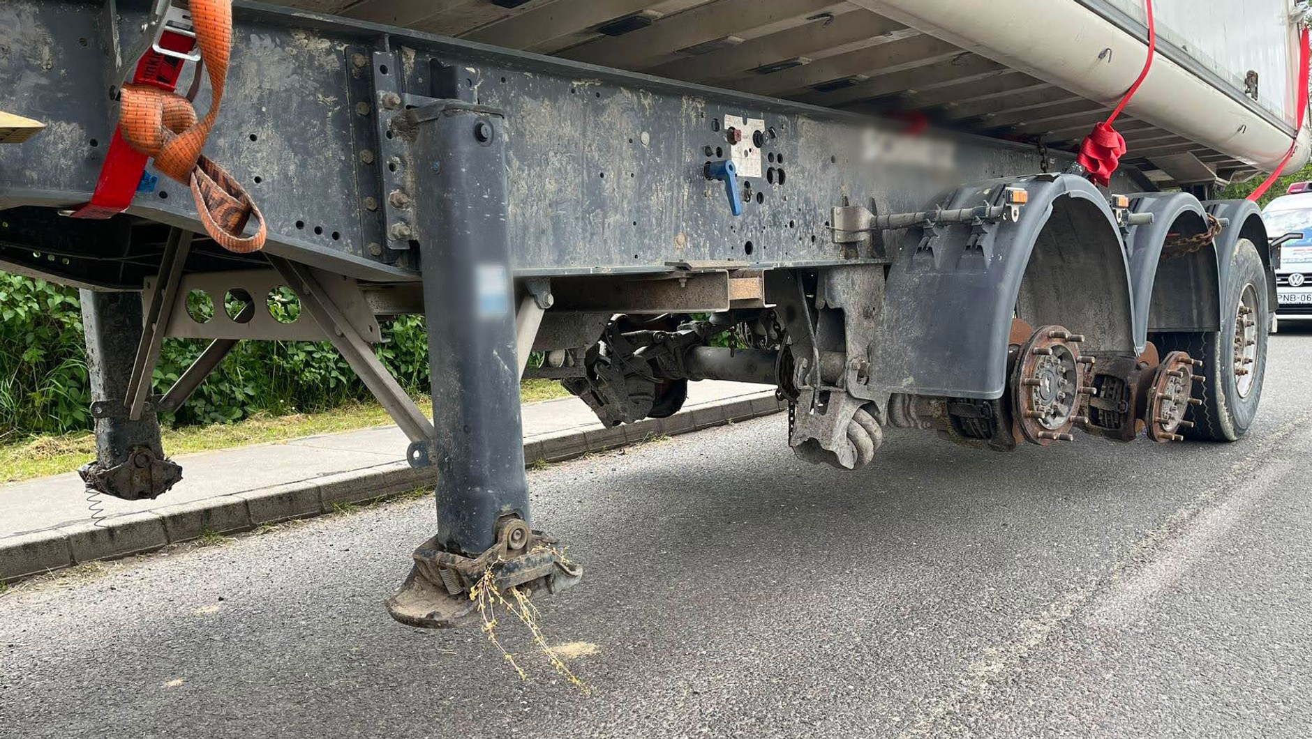 Dalszy ciąg artykułu pod materiałem wideoPo zatrzymaniu okazało się, że duża naczepa była przygotowana do podróży, jak tylko się da. Dwie osie miała prowizorycznie podwieszone na łańcuchach i pasach, więc w efekcie stała jedynie na dwóch kołach ostatniej osi.