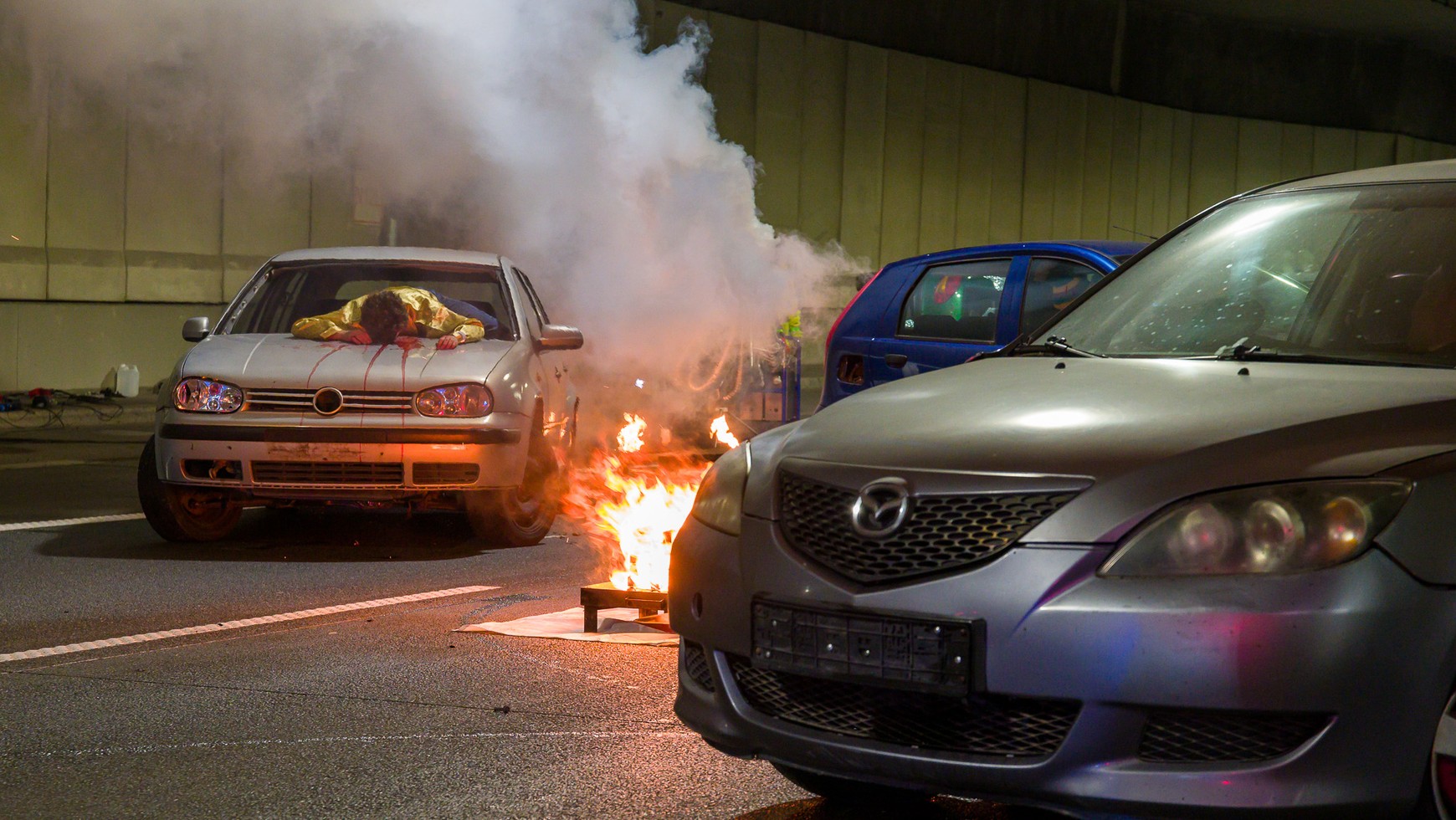 Scenariusz ćwiczeń był następujący: "Kamery wykryły pożar samochodu osobowego. Pasażerowie w panice uciekają, wybiegając na środek drogi. Dochodzi do potrąceń przez przejeżdżające samochody. Gwałtowne hamowanie kolejnych aut".