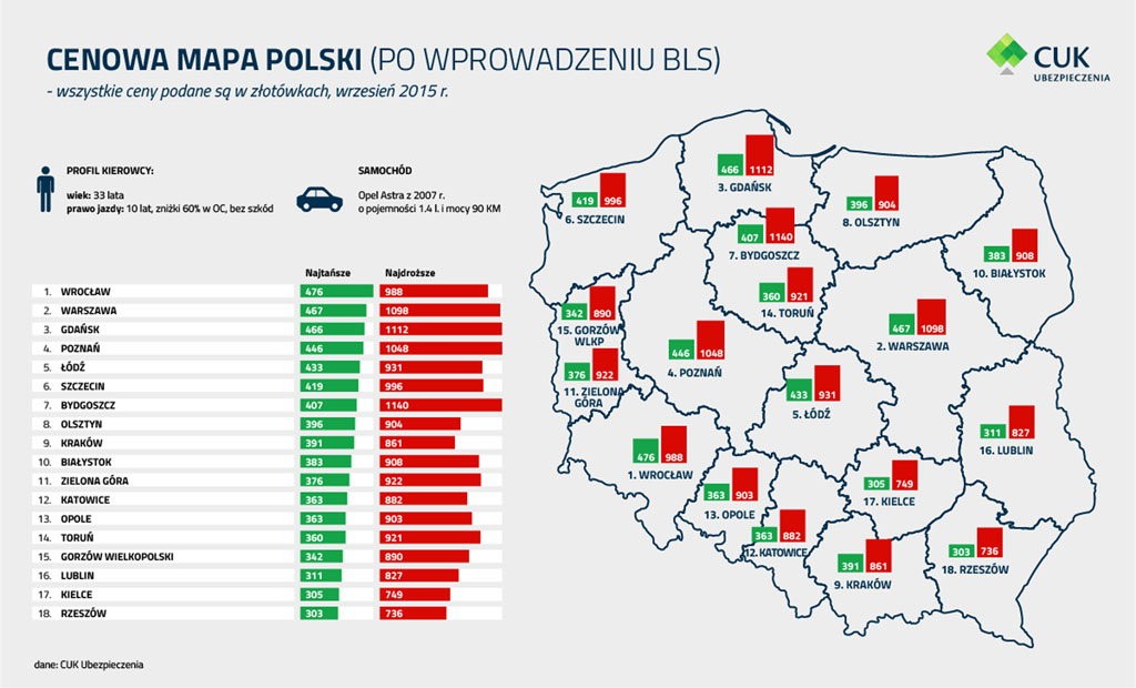 Pół roku po wprowadzeniu BLS można stwierdzić, że kierowcy ze Szczecina (35-procentowy wzrost), Olsztyna (32-procentowa podwyżka) i Poznania (blisko 25-procentowa podwyżka) płacą znacznie więcej za obowiązkowe OC. Natomiast Wrocław, Toruń i Lublin, które odnotowały jedynie kilku procentowy wzrost, najmniej odczuły zmiany na rynku ubezpieczycieli. Obecnie, w rankingu miast wojewódzkich, najwięcej za OC płacą kolejno mieszkańcy Wrocławia, Warszawy, Gdańska i Poznania – co najmniej 466 – 476 zł.