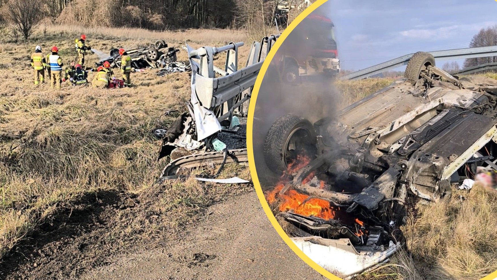 Samochód dachował na polu i stanął w płomieniach. Policjanci wyciągnęli rannego z płonącego auta i natychmiast udzielili mu pomocy. Mężczyzna był przytomny. Miał widoczne obrażenia głowy. Ostatecznie helikopter LPR zabrał go do szpitala.