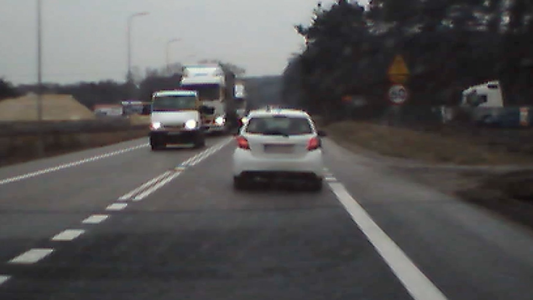 Na filmie dokładnie widać, jak biała Toyota Yaris zbliża się do skrzyżowania i mija auto z naprzeciwka, które zatrzymało się, by skręcić w lewo. Za nim zatrzymał się TIR, ale następny kierowca ciężarówki nie zamierzał czekać i postanowił wyminąć stojące pojazdy. Nie zważając na podwójną linię ciągłą wyjechał wprost na nadjeżdżający samochód osobowy. Szczęśliwie jego kierowca nie spanikował – przyhamował i mocno odbił, mieszcząc się pomiędzy ciężarówką a słupkiem z oznaczeniem drogi. Tylko dzięki temu nie doszło do poważnej kolizji z powodu głupoty i ignorancji prowadzącego ciężarówkę.