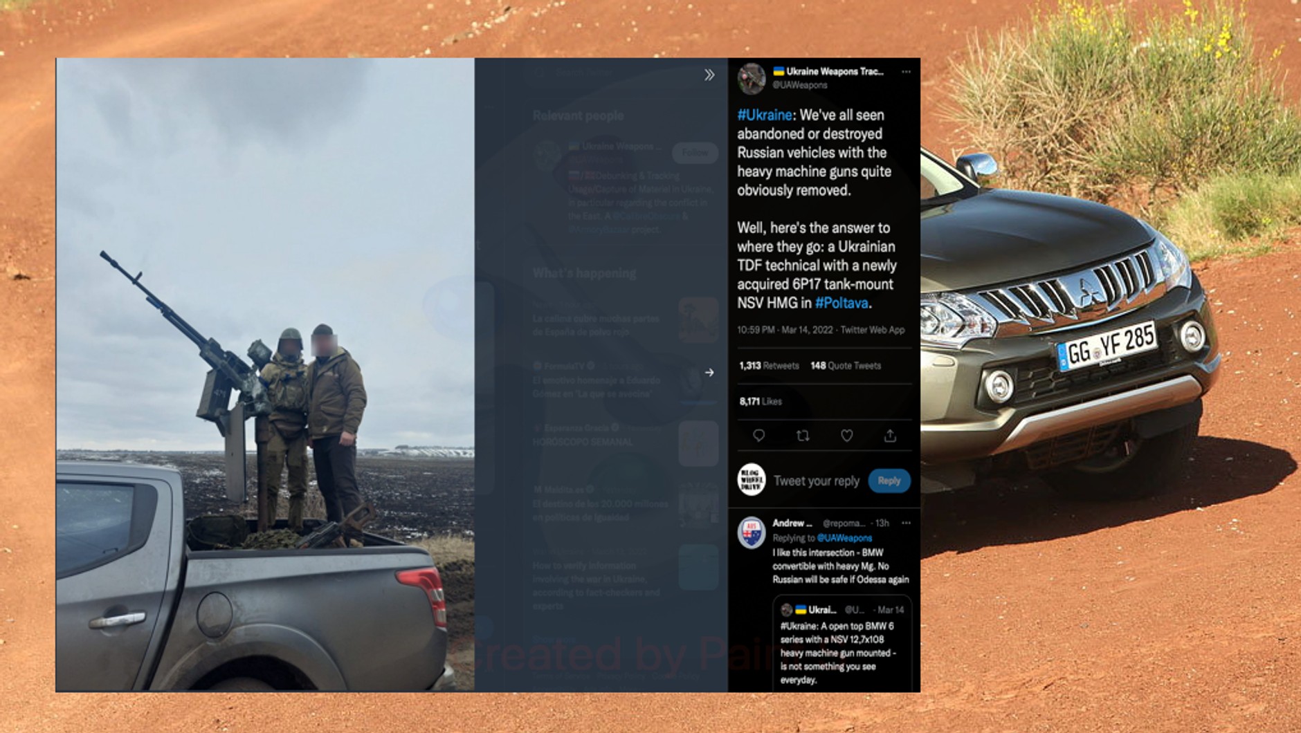 Niedawno pisaliśmy o BMW serii 6 z Mikołajowa, które miało przyspawany z tyłu karabin maszynowy. Dziś raportujemy o kolejnym bardzo podobnym pojeździe. Tym razem jest to pick-up Mitsubishi L200. Z tyłu, w części bagażowej, pojawia się potężna szybkostrzelna broń dużego kalibru wraz z osłoną dla strzelca i pokaźnym magazynkiem na naboje. Konstrukcja zamontowana na BMW wyglądała, jakby CKM mógł strzelać tylko do tyłu. Tutaj urządzenie ma dużo większą swobodę ruchu — może prowadzić ostrzał nawet do przodu, w kierunku jazdy. Warto również nadmienić, że poza osadzonym na obrotnicy karabinem, to "na pace" leży pokaźna ilość innej broni.
