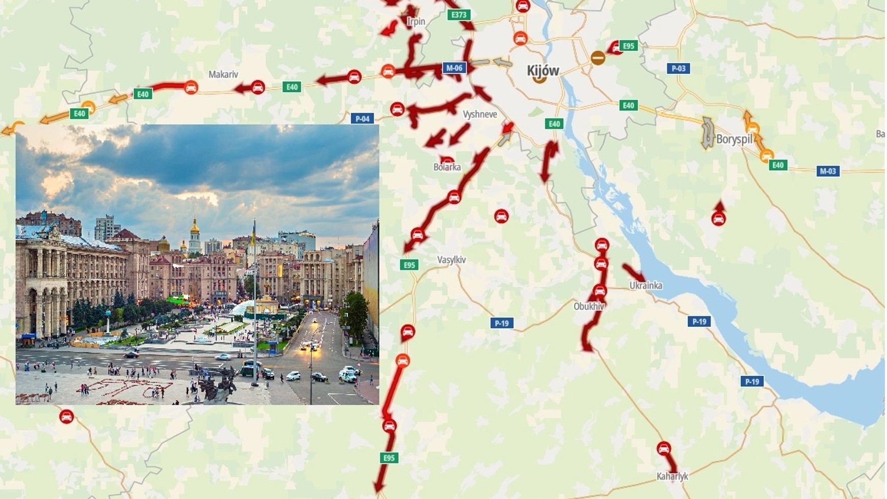 W czwartek 24 lutego 2022 r. Kijów zmienił się nie do poznania na wszystkich serwisach z mapami wskazującymi aktualną sytuację drogową (relację na żywo z wydarzeń w Ukrainie można śledzić na stronie Onetu). Zamiast ogromnych korków w stronę centrum (gdzie mieści się wiele biur i urzędów) odnotowano ogromny ruch w przeciwną stronę. Po rozpoczęciu rosyjskiej inwazji na Ukrainę wielu kierowców zdecydowało się opuścić miasto.