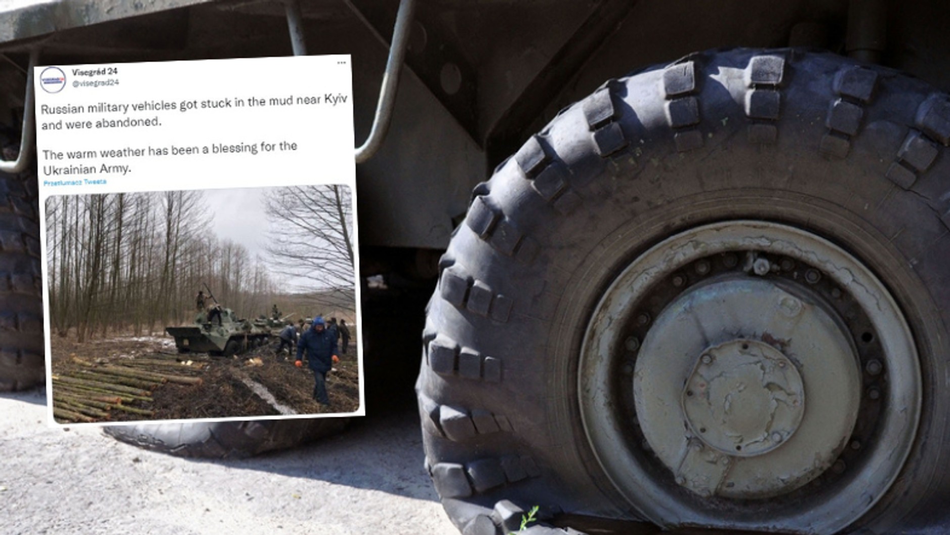 Niespodziewanym sojusznikiem Ukraińców okazała się marcowa pogoda. Wraz z nastaniem cieplejszych dni, lód i mróz odpuściły, a powstały nadmiar wody rozmiękczył drogi i bezdroża. Błoto sprawiło, że wiele dróg jest w tej chwili trudnodostępna, co utrudnia rosyjskim pojazdom opancerzonym przejazd w głąb kraju. Jak informuje serwis Visegrad24, pod Kijowem wozy bojowe ugrzęzły w błocie, a rosyjscy żołnierze musieli pozostawić je w lesie.