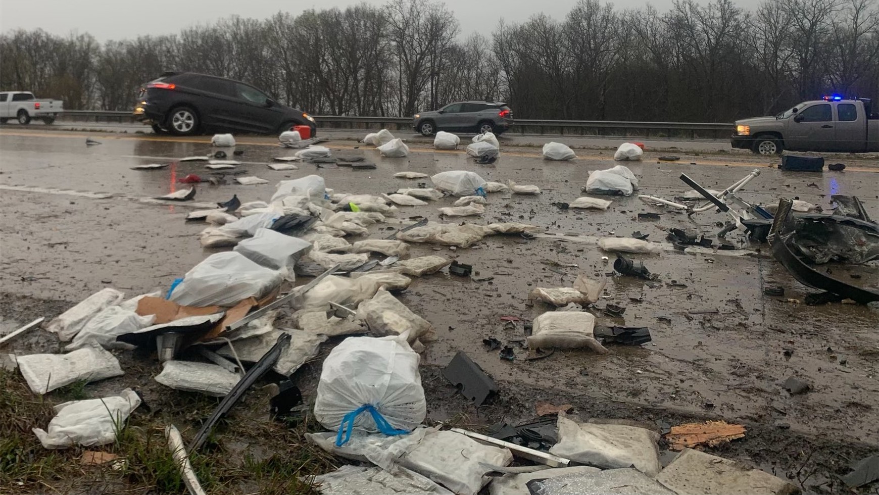 Do nietypowego wypadku doszło wczesnym rankiem 20 kwietnia w hrabstwie Callaway, w stanie Missouri, na autostradzie międzystanowej nr 70. Półciężarówka GMC Sierra, która próbowała ominąć rozbite na drodze auta, wjechała w tył dużej ciężarówki, a następnie uderzyła w pickupa. W rezultacie transportowany towar zablokował drogę.