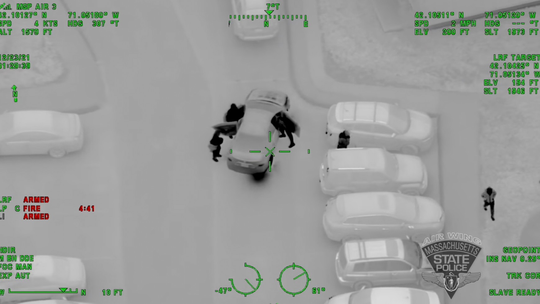 Policja stanowa z Massachusetts udostępniła nagranie z nocnego pościgu z 23 grudnia 2021 r. Co prawda akcja zaczęła się od klasycznego pościgu, w którym rozbito aż cztery pojazdy, ale w związku ze zbyt dużym zagrożeniem, jakie stwarzali na drodze ścigani, policjanci zaniechali dalszej akcji. Nie oznacza to jednak, że złodziejom się upiekło. Wykorzystano helikopter wyposażony w precyzyjne kamery termowizyjne.
