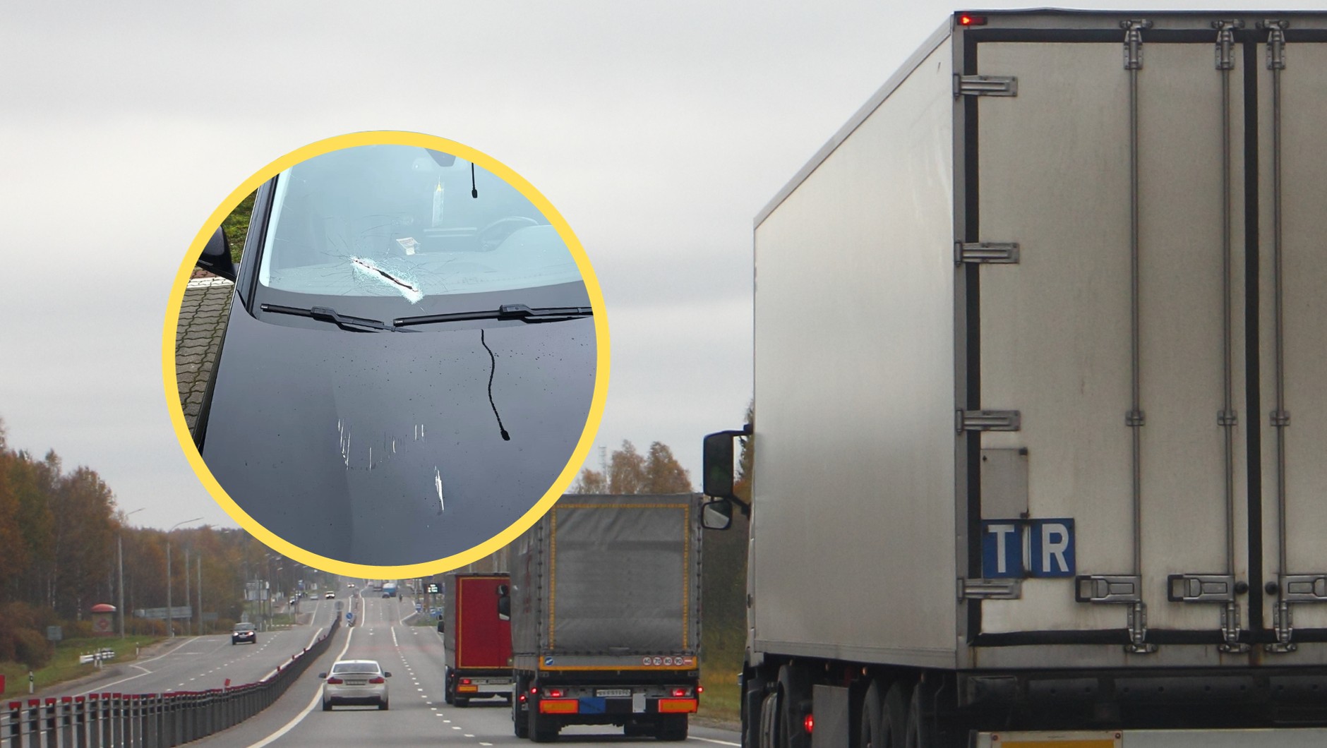 W pewnym momencie większy z samochodów odjechał w stronę Człuchowa, z kolei kierowca Peugeota zrobił sobie postój na stacji paliw. To właśnie tam zobaczył, co stało się z szybą jego auta. Okazało się, że z ciężarówki odpadł stalowy element, który odbił się od maski osobówki, a następnie uderzył w szybę. Szkło pękło, a do wnętrza samochodu wpadł niebezpieczny odłamek i zatrzymał się na siedzeniu pasażera. Kierowca wezwał na miejsce policję, której przekazał numer rejestracyjny ciężarówki.