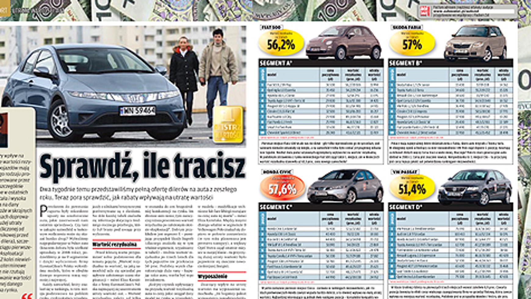 Pretekstem do powstania raportu były rekordowe upusty na zeszłoroczne auta, jakie zaserwowali nam ostatnio sprzedawcy. Czy tani w zakupie samochód w końcowym rozliczeniu może się okazać bardzo drogi? Wybraliśmy najpopularniejsze w Polsce auta (kluczem doboru była wielkość sprzedaży w 2008 roku), podzieliliśmy je na 9 segmentów i dzięki wyliczeniom firmy EurotaxGlass’s Polska wyłoniliśmy modele, które w obrębie danego segmentu tracą najmniej i najwięcej.
