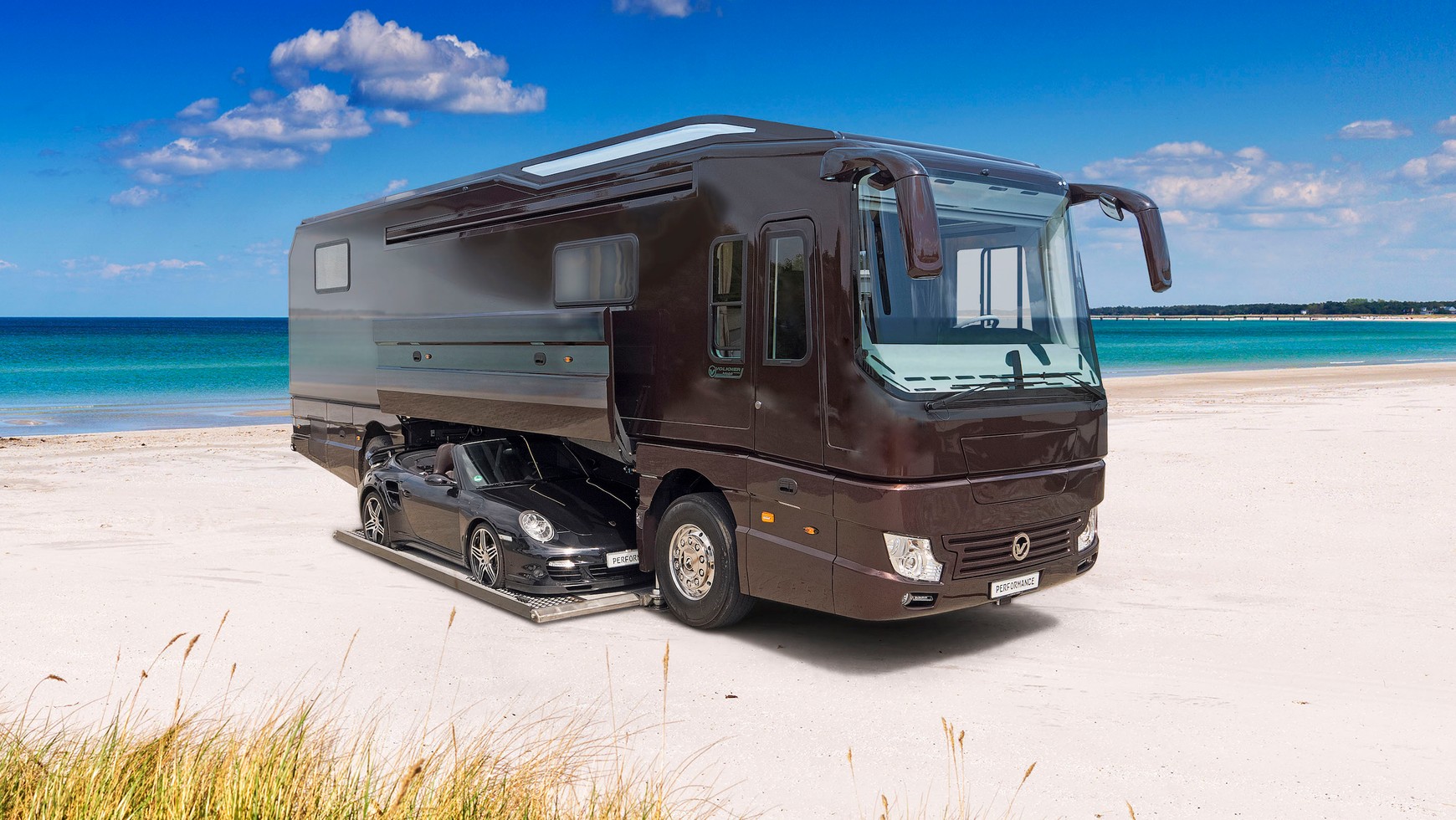 Volkner Performance S to pojazd mieszkalny dla najbardziej wymagających. Na pierwszy rzut oka wygląda jak kamper osadzony na ramie ciężarówki. To nieprawda, bo rama Volknera jest zaprojektowana od podstaw i ma opatentowany przez firmę przekrój litery "H". Wszystko po to, żeby zmieścić pomiędzy osiami elektrycznie opuszczaną i wysuwaną płytę, na której parkuje supersamochód. Specjalne windy podnoszą całego kampera, następnie opuszczają płytę i wysuwają ją na bok. Najlepiej zobaczyć to na poniższym nagraniu youtubera Enesa Yilmazera.