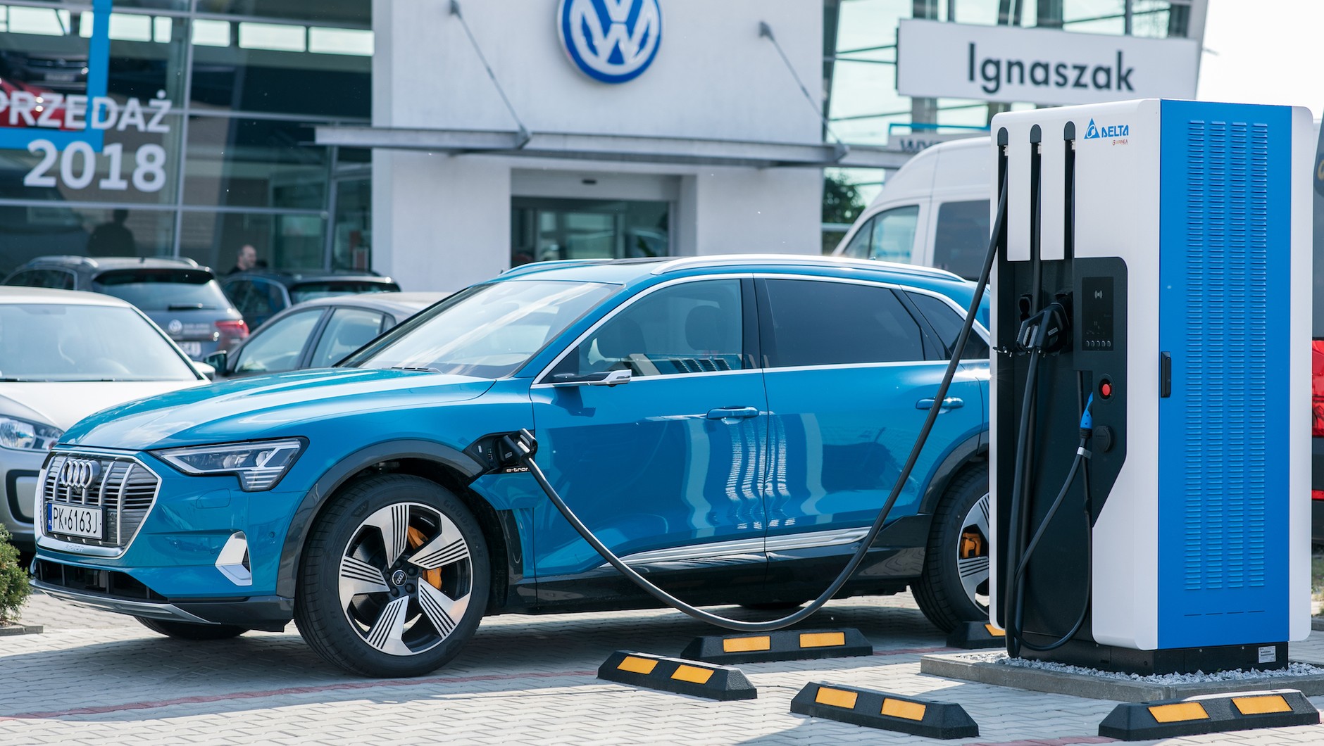 Szybkie ładowarki będą znajdować się przy salonach marek należących do Grupy Volkswagen (VW, Audi, Porsche, Skoda, Seat). Pierwsze z nich już działają, np. stacja o mocy 50 kW u dealera Ignaszak w Kaliszu. Co ciekawe, zasilana jest ona bateriami fotowoltaicznymi, które umieszczono na dachu obiektu. Przykład daje też sama firma Volkswagen Group Polska, która instaluje w swojej siedzibie w Poznaniu 25 stacji z 34 punktami ładowania dostępnych dla pracowników i gości.