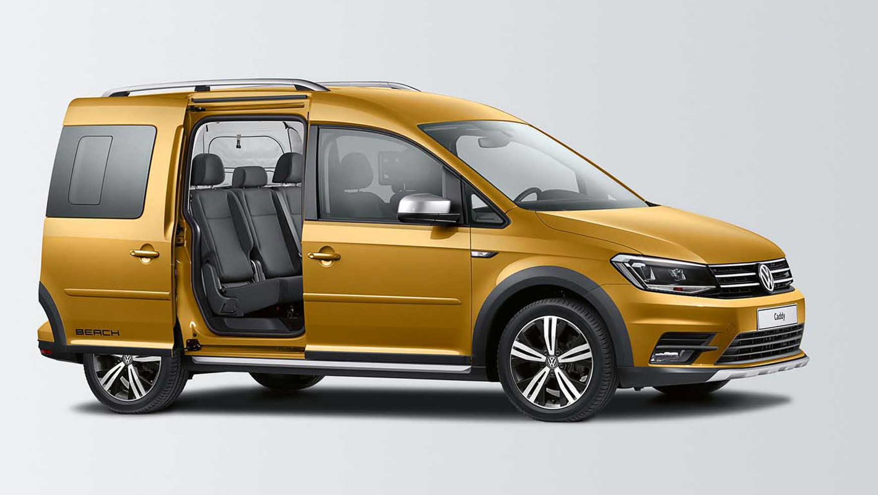 Najmniejszym z modeli niemieckiej marki przygotowanych do wypraw turystycznych jest Volkswagen Caddy Beach, który oferowany jest z pakietem Alltrack, elementami ochronnymi nadwozia oraz 17-calowymi kołami. We wnętrzu znalazło się składane łóżko o wymiarach 2,0 m x 1,1 m, dwie dodatkowe kieszenie bagażowe oraz kurtyny zakrywające okna. Do kompletu można też zamówić dwuosobowy namiot, który może być połączony z tylną pokrywą bagażnika.