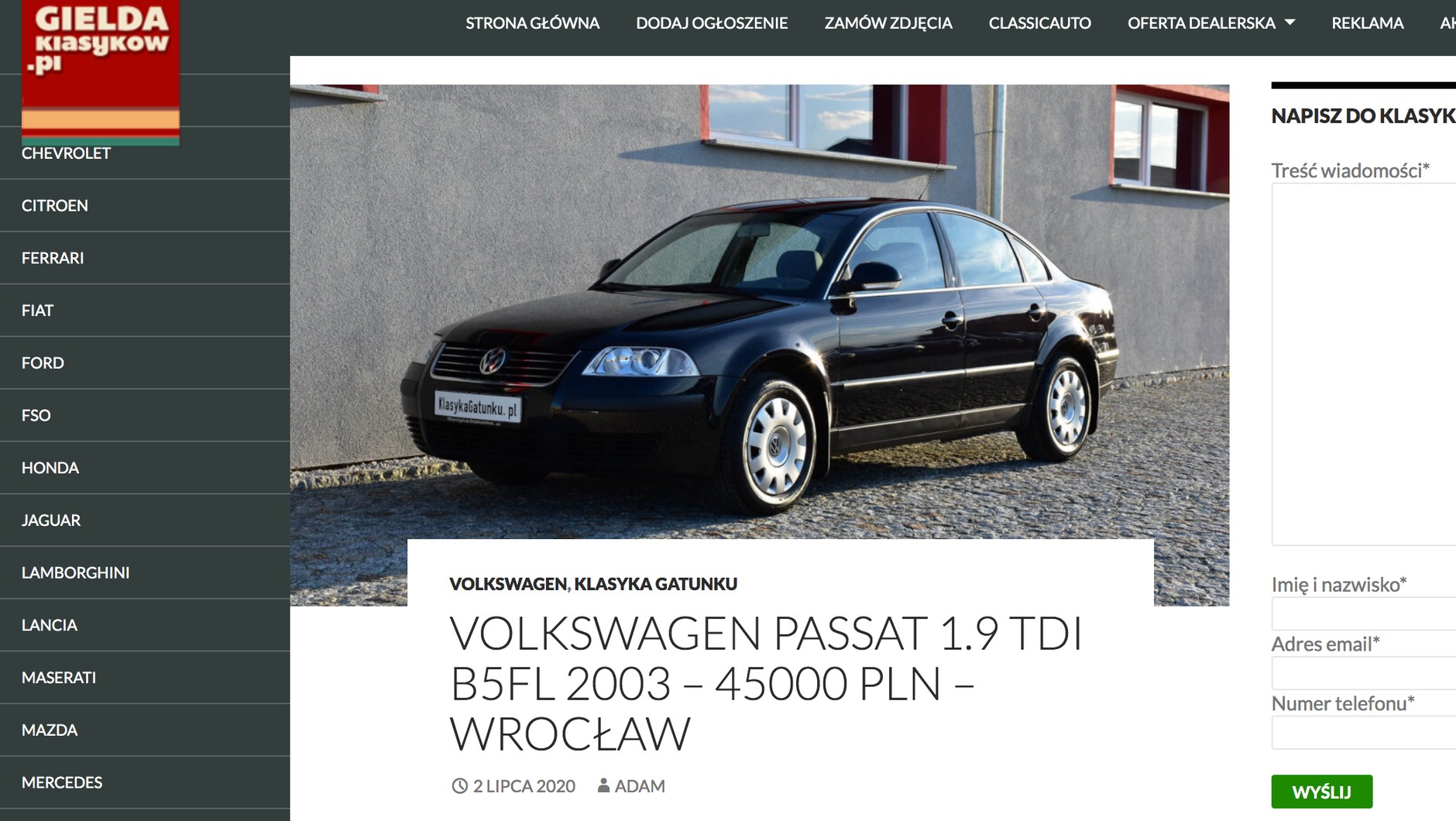 Auto zostało wystawione na sprzedaż na portalu Giełda Klasyków i stoi we Wrocławiu. Jak czytamy w treści ogłoszenia, samochód pochodzi z polskiego salonu (produkcja – 2003 r., rejestracja – kwiecień 2004 r.) i zdążył do tej pory przejechać jedynie 25 451. km. Według sprzedającego Volkswagen Passat B5 1.9 TDI był garażowany, nie jeździł zimą i nigdy nie uczestniczył w wypadku ani kolizji – fabryczny lakier. Wnętrze faktycznie wygląda niemal jak nowe, na aucie są też jeszcze oryginalne opony, jednak ewentualny kupujący otrzyma komplet nowych "gum" wraz z autem. Cena obejmuje także m.in. przegląd wraz z wymianą oleju i filtra oraz paska rozrządu – gdyby ktoś chciał z tej usługi zrezygnować, cena będzie niższa.