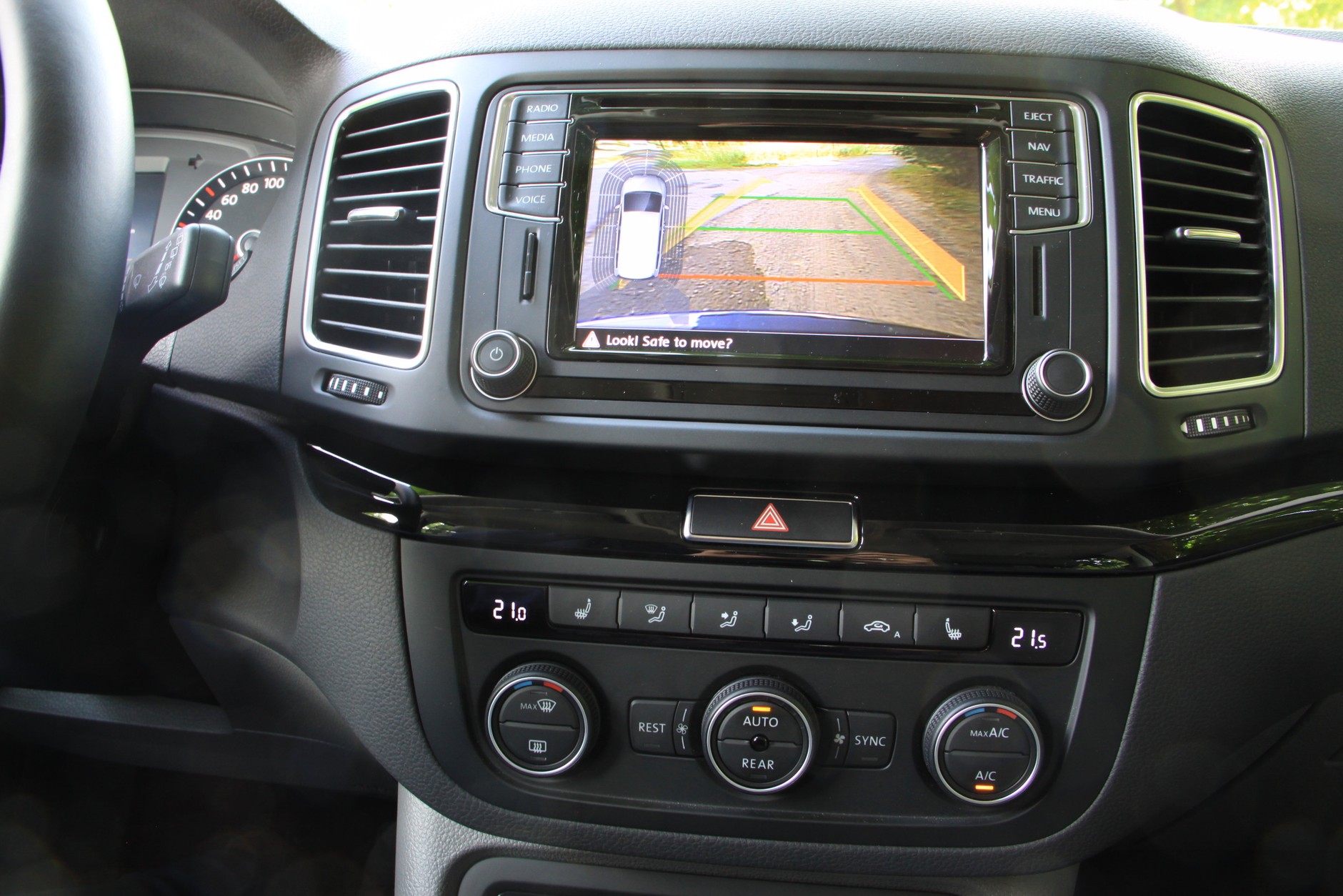 Sharana wreszcie możemy zespolić z naszym smartfonem, dzięki systemom MirrorLink, Android Auto oraz CarPlay, które tutaj znajdują się pod wspólną nazwą App-Connect. Aplikacje ze smartfona obsługujemy za pomocą nowego 6,5 calowego wyświetlacza. Dotyczy to także nawigacji, ta znajdująca się w Sharanie podczas naszego testu nieco się pogubiła.