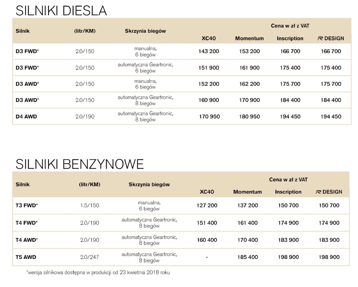 Volvo XC40 przez pierwszych kilka miesięcy będzie dostępne wyłącznie z napędem na cztery koła z silnikiem Diesla D4 (190 KM) lub z jednostką benzynową T5 (247 KM) oraz w jednej z trzech wersji wyposażenia: Momentum, R-Desing oraz Inscription. D4 pierwszą setkę osiąga po 7,9 sekundy, natomiast benzynowe T5 po 6,5 sekundy. Pozostałe wersje silnikowe, w tym hybryda, dołączą do oferty w kwietniu 2018 roku. Jej trzon będą stanowić dwulitrowe, czterocylindrowe silniki z rodziny Drive-E. Będzie jednak jeden wyjątek. Znajdzie się wśród nich nowa, trzycylindrowa jednostka T3 o pojemności 1.5 l i mocy 150 KM oferowana wyłącznie z napędem na przednie koła. Ofertę uzupełnią T4 190 KM i D3 150 KM.