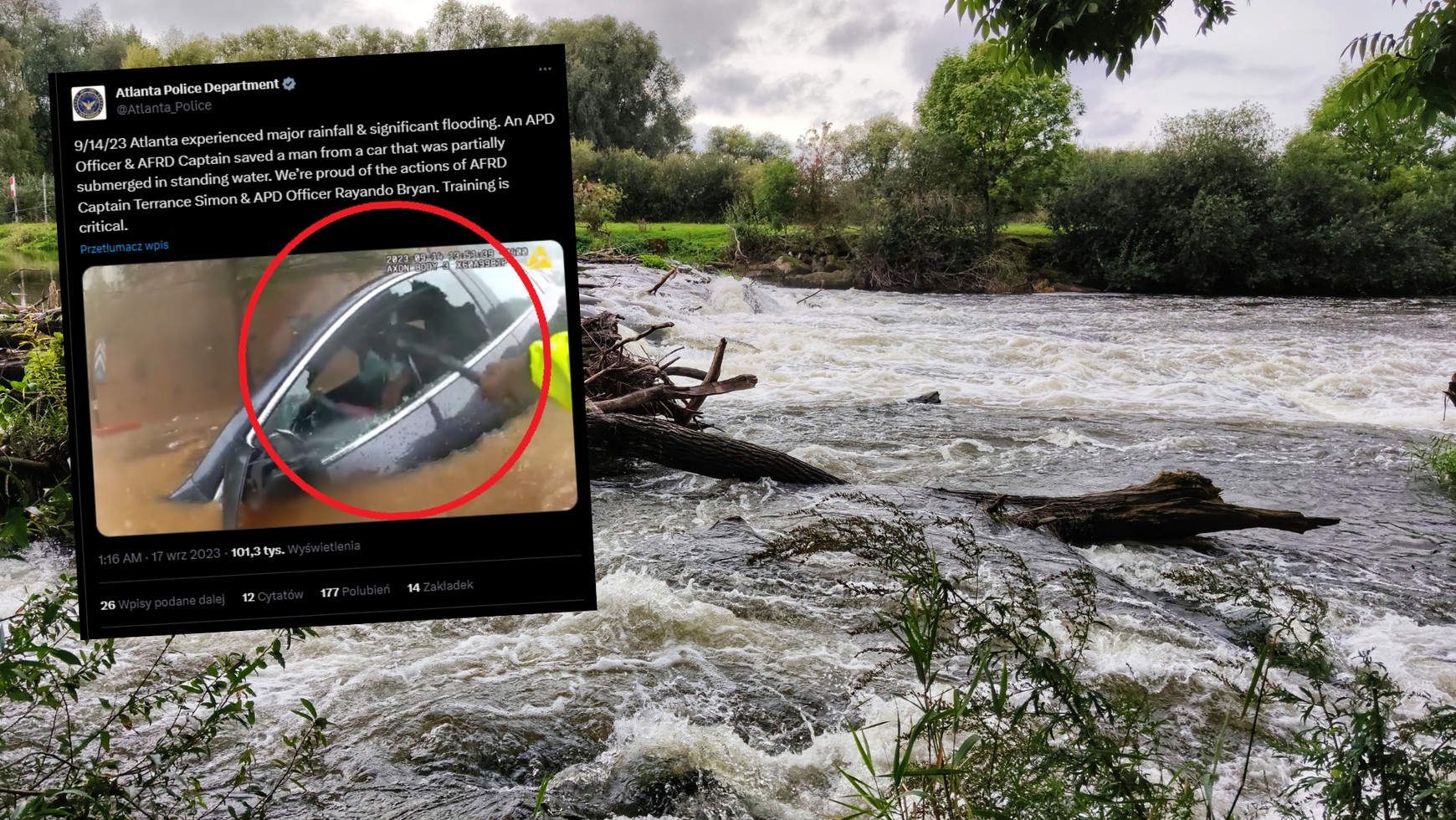 W połowie września Atlanta (stan Georgia) została nawiedzona przez ulewy, które co prawda trwały krótko, ale były tak intensywne, że doprowadziły do powodzi w mieście. Podczas patrolowania ulic, które zamieniły się w rwące potoki, jeden z policjantów zauważył niemal całkowicie zalany samochód. Okazało się, że w środku uwięziony był jego kierowca.