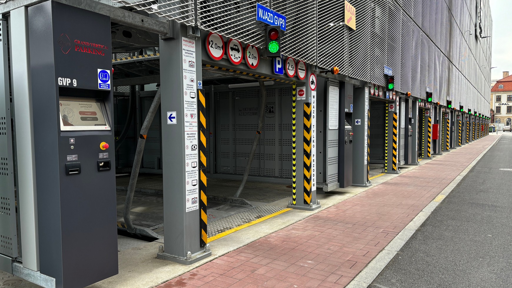 Skręcając w ulicę Tylną Mariacką, od razu zauważysz dwa wysokie "bloki" z wjazdami dla samochodów i napisem "Grand Vertical Parking". Pod metalowymi maskownicami kryją się dwa zespoły maszyn – pierwszy obiekt ma 12 modułów, drugi – osiem. Oba zestawy pomieszczą na rotacyjnych platformach do 240 pojazdów.