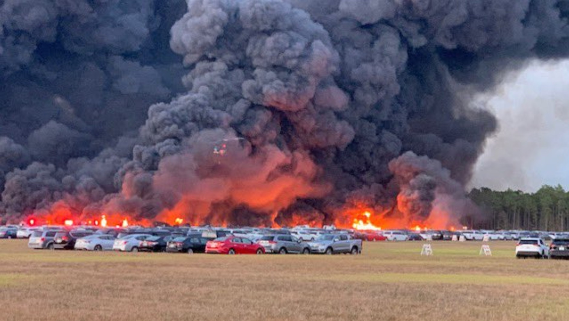 Prowizorycznie przygotowane miejsce postoju było zwykłą łąką, która okazała się cmentarzyskiem dla zaparkowanych aut. Wybuchł tam pożar, który według amerykańskich mediów strawił 3500 samochodów. Straż pożarna z hrabstwa Lee Country walczyła z ogniem przez całą noc. Teraz trwa badanie przyczyn pożaru. Eksperci podejrzewają, że przyczyną pożaru mógł być rozgrzany katalizator jednego z samochodów, który doprowadził do zapalenia się wysuszonej trawy.