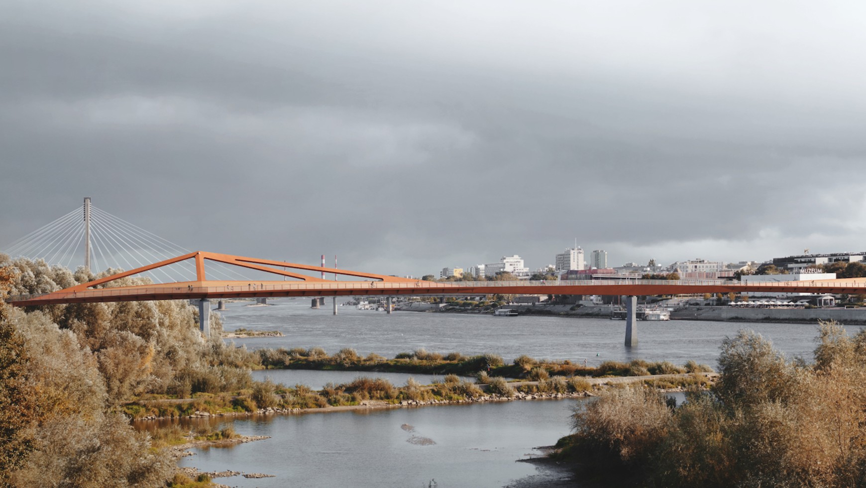 Jak podaje na swoich stronach Zarząd Dróg Miejskich, nowy most będzie liczył ok. 500 m długości. Szerokość konstrukcji wygiętej na kształt błyskawicy (będą tacy, którym to się z pewnością nie spodoba! – przyp. Red.) jest zmienna i w najwęższym punkcie ma 6,9 m, a nad nurtem rzeki rozszerza się do 16,3 m. Ma to być jedna z najdłuższych na świecie przepraw tylko dla pieszych i rowerzystów. Powstanie na wysokości ul. Karowej na lewym brzegu i ul. Okrzei na prawym brzegu. Most stworzy nowe połączenie spacerowe między Bulwarami Wiślanymi, które stanowią efektowne miejsce wypoczynku, odwiedzane tłumnie niemal przez cały rok, a praskim brzegiem Wisły, który jest bardziej naturalny i niezagospodarowany. Dziś te dwa brzegi funkcjonują w zasadzie osobno, bo trudno dostępny dla pieszych most Śląsko-Dąbrowski nie zachęca, by ją przekroczyć. Dzięki nowej przeprawie przejście z jednego na drugi brzeg będzie łatwe i wygodne.